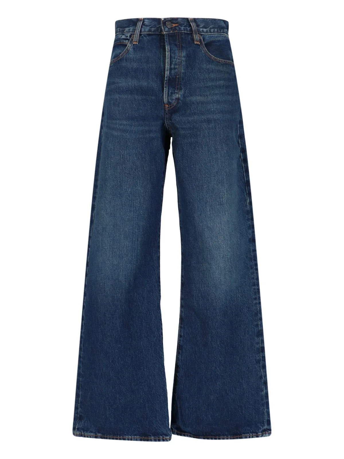 FRAME WIDE BLUE COTTON DENIM JEANS, HIGH WAIST, BUTTON CLOSURE, BELT LOOPS, FIVE POCKETS DESIGN, WIDE LEG. PRODUCT INFO PRODUCT CODE 2002210DTOX COMPOSITION: 100% COTTON SIZE AND FIT: REGULAR FIT MADE IN: TUNISIA