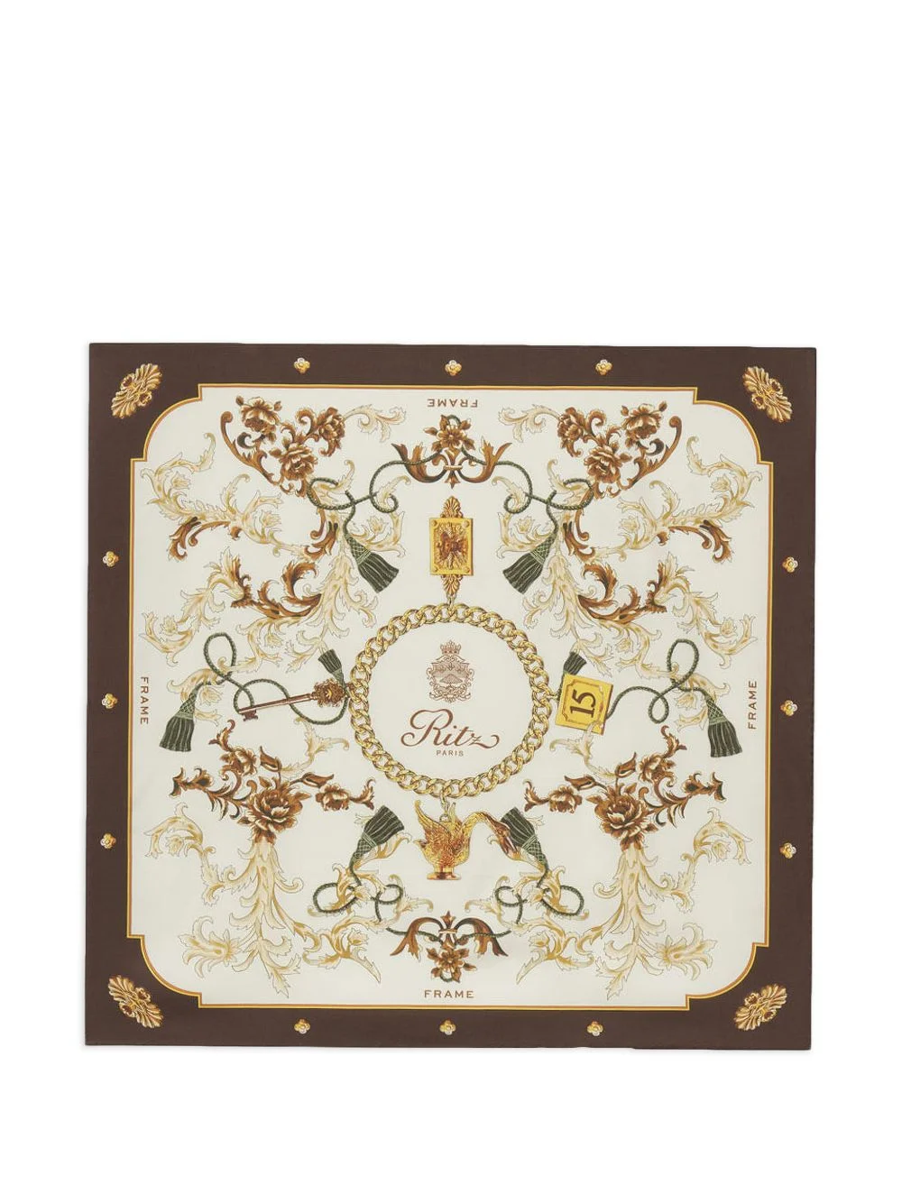 x Ritz Paris printed scarf Highlights - Beige and multicolour - Logo detail - Brown border - Square shape Made in France Composition Silk 100% Washing instructions Dry Clean Only