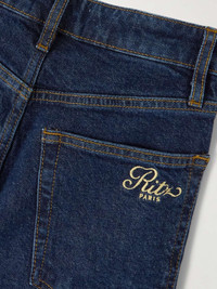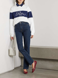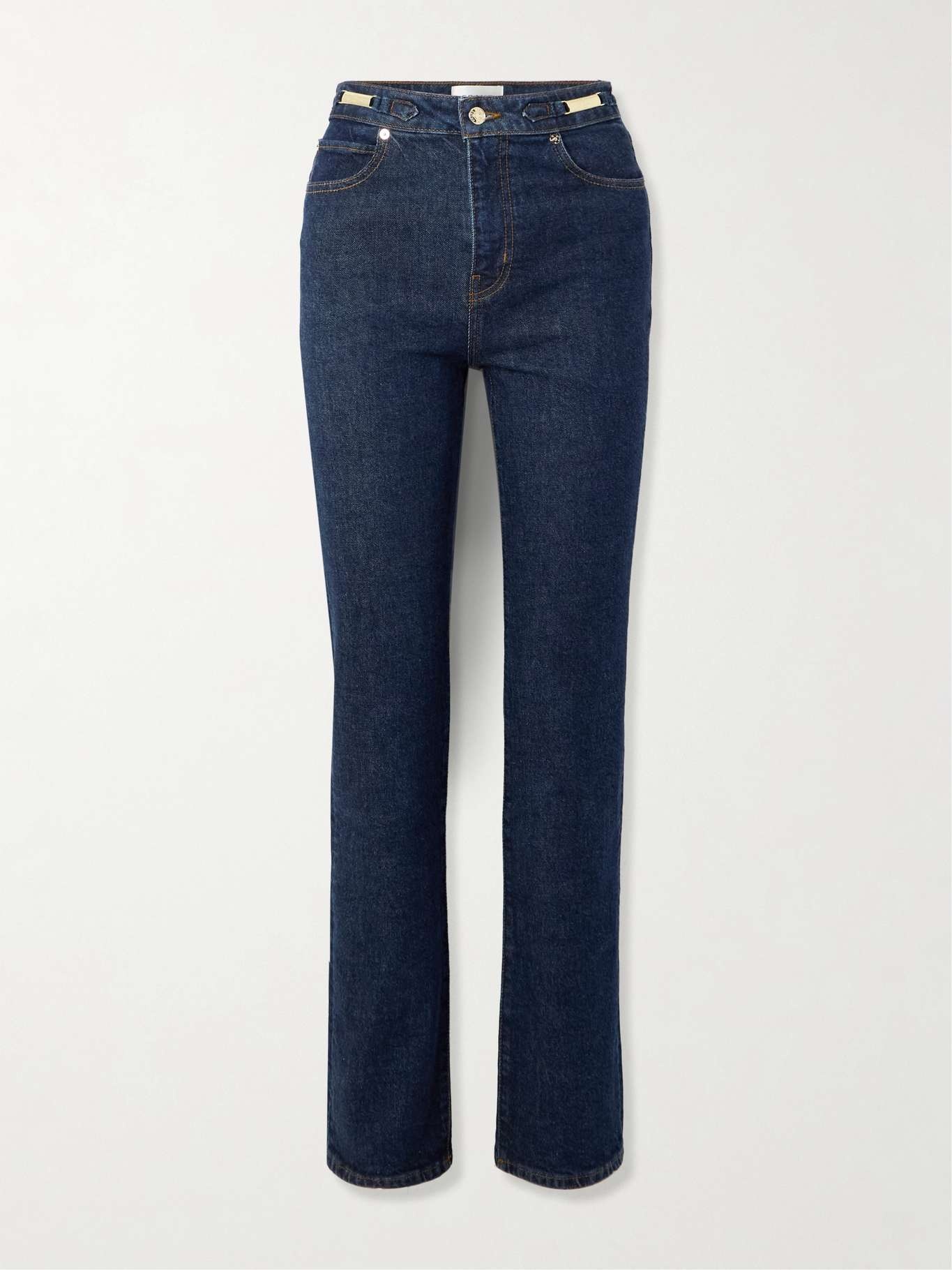 EDITORS'NOTES Made in collaboration with the Ritz Paris, FRAME's 'The Ruler' jeans are updated with gold-tone hardware along the high-rise waist and the luxurious hotelier's logo embroidered at the back pocket. They're made from denim in a classic dark wash and have straight legs. SIZE & FIT Model measurements: - Fits true to size, take your normal size - High-rise, intended for a straight-leg fit - Mid-weight, non-stretchy denim - Size 26 jeans have an inside leg of 31"/ 79cm - Model is 180cm/ 5'11" and is wearing a size 26 - Bust: 81cm/ 32" - Waist: 63cm/ 25" - Hip: 91cm/ 36" DETAILS & CARE - Blue denim - Button and concealed zip fastening at front - 99% cotton, 1% elastane - Machine wash