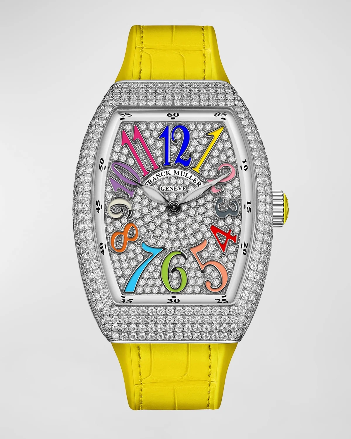 Franck Muller watch from the Vanguard collection 332mm tonneaushaped case in stainless steel Watch head decorated with white diamonds Yellow alligator strap with diamond buckle Pave dial with rainbow Arabic numerals Inner bezel with 60minute indicator Twohand quartz movement Total carat weight: 4.67 Made in Switzerland