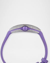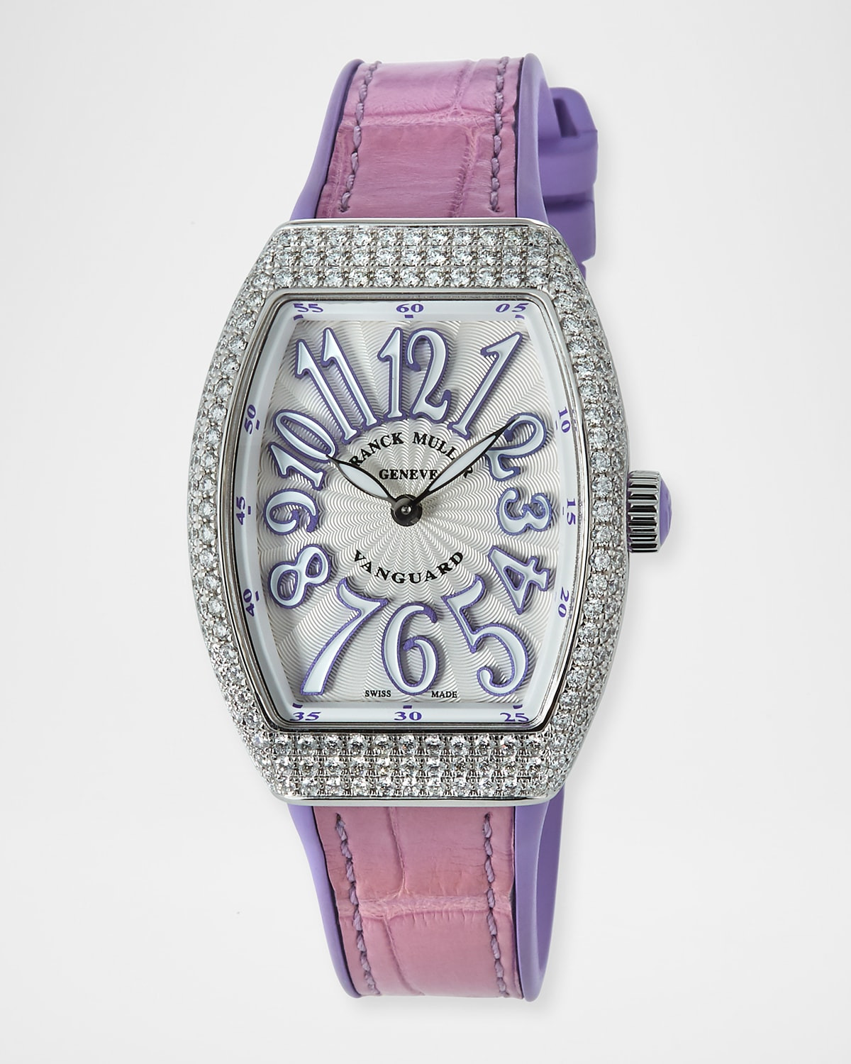 - Franck Muller watch from the Vanguard Collection. - 32mm oval case and stainless steel hardware. - Purple alligator leather strap with rubber lining. - White dial with 60-minute detail at trim. - Graduating Arabic numeral indices. - Allover white diamond pave bezel. - White diamonds at thorn buckle. - 3.84 total diamond carat weight. - Two-hand quartz movement. - Made in Switzerland.