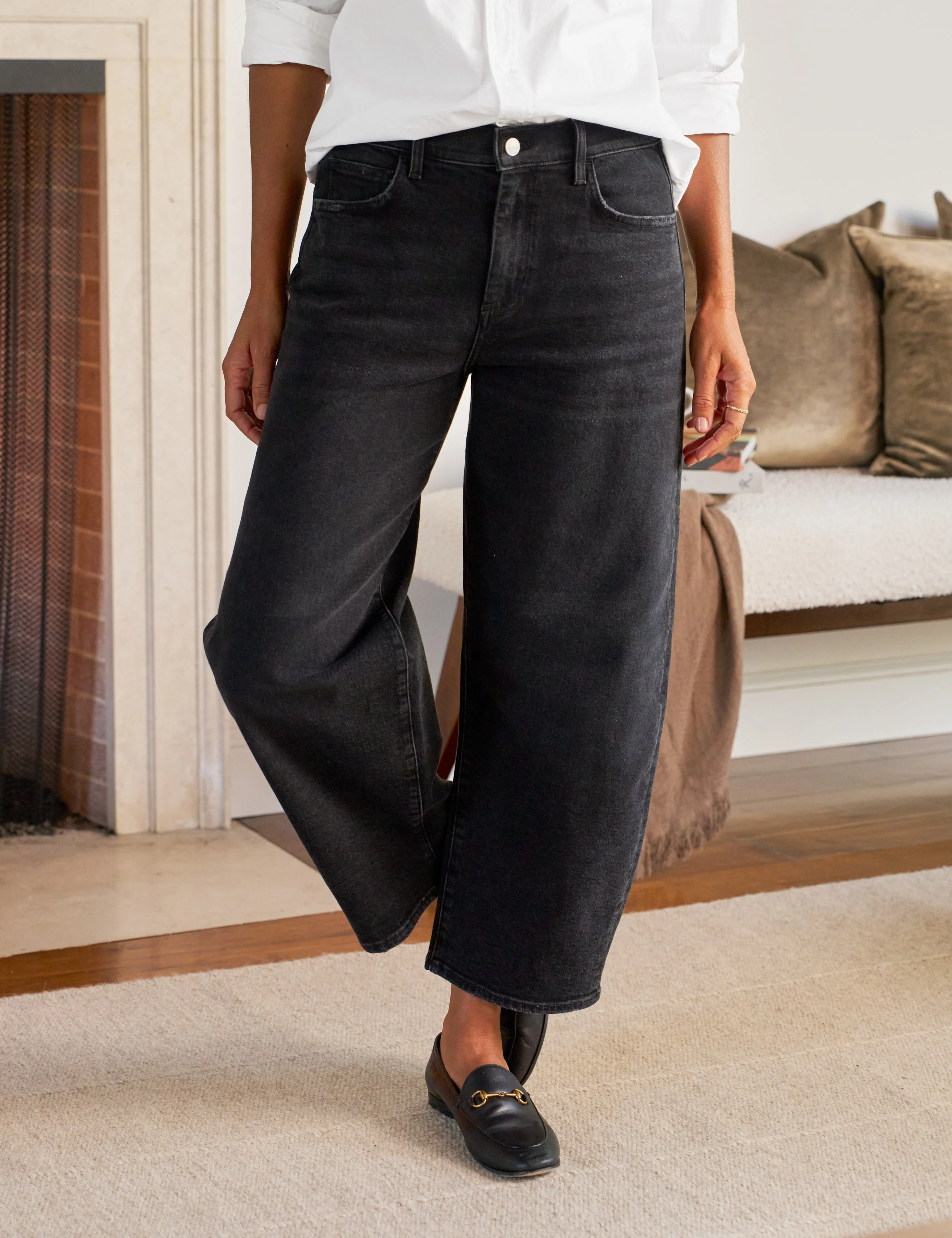 Brennan is the barrel jean we all want. Made in our new California Vintage Denim, this softly structured, incredibly comfortable jean plays with proportion in a way that looks and feels fresh. A gently curved “barrel” leg hits your ankle and beautifully accentuates your waist. - Finished hem - Zip fly with button closure - Waistband that sits just below your natural waistline - Barrel leg fit - Paloma is 5'9" wearing a size 27 - Inseam: 26.5”, front rise: 11.25" including waistband, leg opening: 17.5" (size 27) - This style was made using a small batch garment-dye process, giving each piece a unique look that will evolve and fade over time - Style Code: BARRELJEAN-BKVD FABRIC + CARE - California Vintage Denim, 99% Cotton, 1% Elastane - Made from cotton, this slightly structured, lived-in denim softens and molds to your body over time for a truly made-to-move-with-you fit. - We recommend washing separately in cold water before the first wear to prevent any color transfer. After that, machine wash cold with like colors and tumble dry low. - Woven in Turkey, Made in Sunny California
