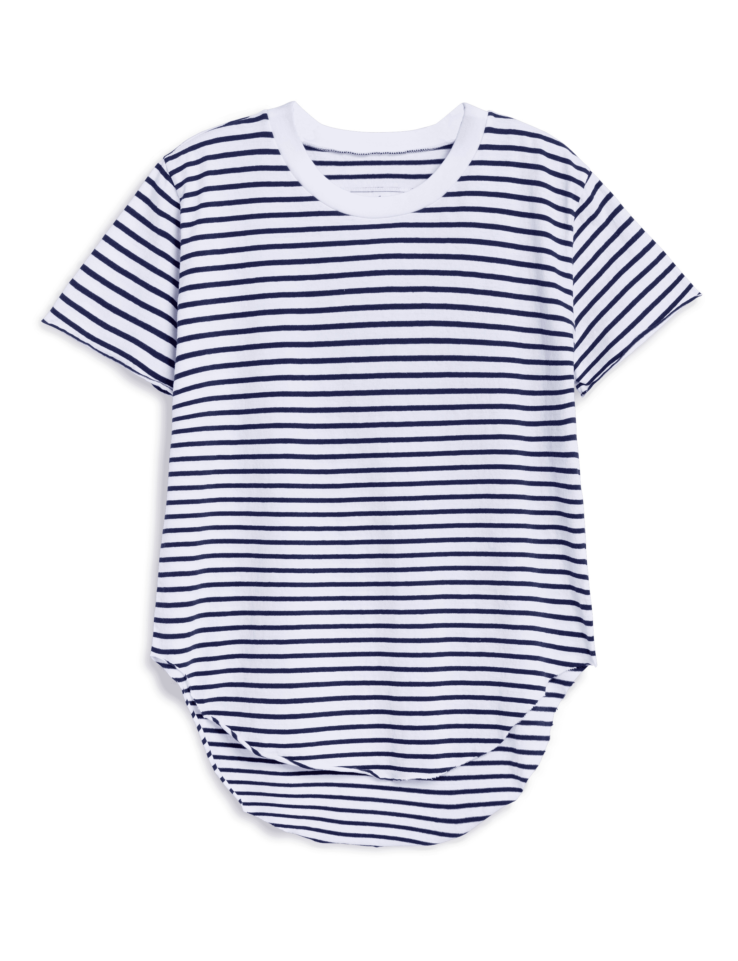 The Perfect Tee's crew neck, curved raw hem, and just-relaxed-enough fit pair perfectly with all the other staples in your closet. - Hand-cut curved raw hem that covers your bum - Ribbed crew neck - Short sleeves - Ray is 5'10" with a 34" bust wearing a size S - Style Code: LAB219-WBRS FABRIC + CARE - This durable, open-end yarn is lightweight, breathable, and feels like your favorite vintage tee. - 100% Cotton, made in the U.S. from seed to finish. Cotton is grown in the Delta region, spun into yarn in North Carolina, then knitted and crafted into garments in LA. - We recommend washing separately in cold water before the first wear to prevent any color transfer. After that, machine wash cold with like colors and tumble dry low. - Learn more in our Fabric Guide.