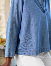 Gabi's continuous, three-quarter-length sleeve and wider hem deliver a flowy, feminine feel. This easy-to-wear piece epitomizes laidback elegance. - Slightly cropped fit - Wide finished block hem - Collared V neckline - Continuous three-quarter length sleeves - Milan is 5'9" with a 33" bust wearing a size S - This garment is made using indigo fabric with a small batch stone washing process, giving each garment a unique look that will evolve and fade over time - Style Code: GABI-VWD FABRIC + CARE - This “legendary” denim is hand-finished by artisans in California, featuring one-of-a-kind details—and it only grows softer with every wash. - 100% Cotton. Our cotton is sourced, spun, dyed, and woven in Egypt, then cut, sewn, and finished right here in California. - We recommend washing separately in cold water before the first wear to prevent any color transfer. After that, machine wash cold with like colors and tumble dry low. - Learn more in our Fabric Guide.