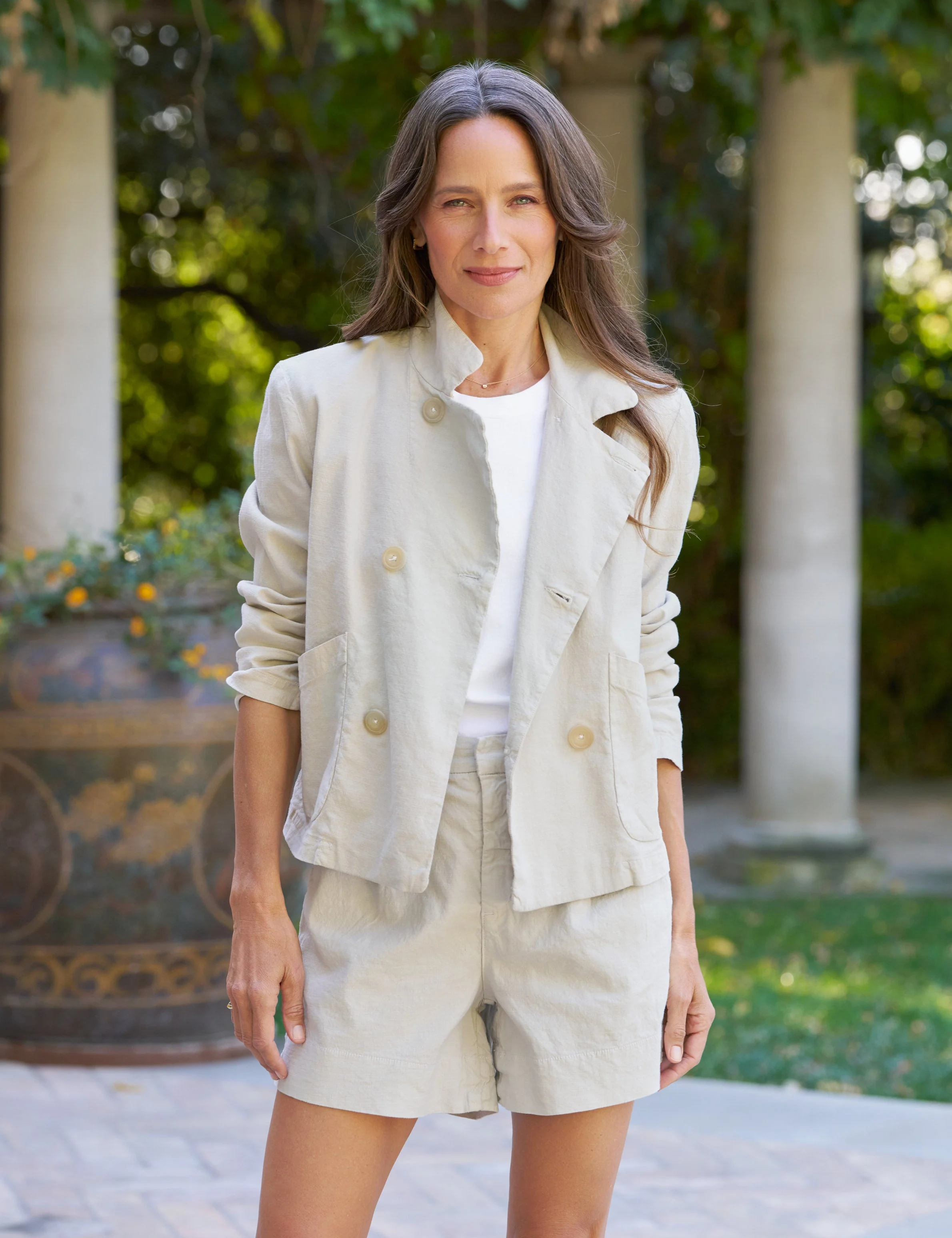 Prepare to be obsessed with this lightweight take on the Mini Belfast you know and love! Italian Performance Linen gives a more structured, beautifully tailored look and feel to everyone’s favorite cropped peacoat, perfect for warmer days. - Notched lapels - Double-breasted horn buttons - Roomy patch pockets - Long easy-to-scrunch sleeves - Simone is 5'8" with a 34" bust wearing a size S - Style Code: MINIBELFST-CMTL FABRIC + CARE - Heavier than our classic shirting linen, we developed Italian Performance Linen with moves-with-your-body-all-day performance in mind. - 50% Cotton, 48% Linen, 2% Elastane. Our linen fiber comes from France, the raw cotton is sourced from the U.S., is spun into yarn in Southern Italy, and finished in LA. - Turn this garment inside out, machine wash cold, and tumble dry low. - Learn more in our Fabric Guide.