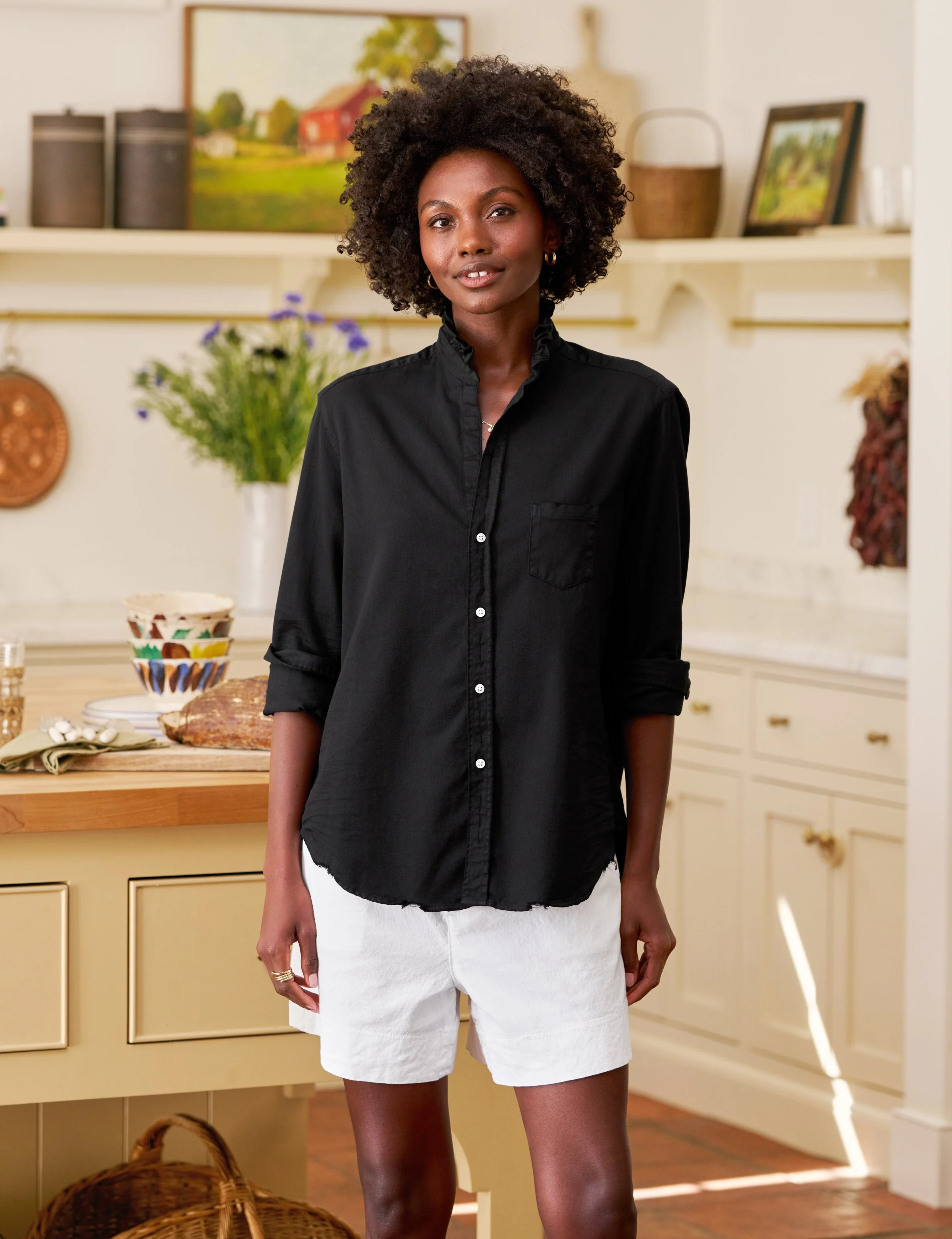 Eileen is our best-selling button-up for a reason. Easy to wear, airy on the body, and ridiculously flattering with our signature button placement, we’ve added a gorgeously feminine ruffled collar to dress up an already iconic piece. - Hand-distressed raw shirttail hem long enough to cover your bum - Shaped like a circle with soft rounded shoulders and no back pleat - Chest pocket - Signature bust flattering button placement and long sleeves with button cuffs - Milan is 5'9" with a 33" bust wearing a size S - This style was made using a small batch garment-dye process, giving each piece a unique look that will evolve and fade over time - Style Code: RUFFLEEILN-BKCD FABRIC + CARE - This “legendary” denim is hand-finished by artisans in California, featuring one-of-a-kind details—and it only grows softer with every wash. - 100% Cotton. Our cotton is sourced, spun, dyed, and woven in Egypt, then cut, sewn, and finished right here in California. - We recommend washing separately in cold water before the first wear to prevent any color transfer. After that, machine wash cold with like colors and tumble dry low. - Learn more in our Fabric Guide.