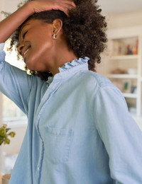 Eileen is our best-selling button-up for a reason. Easy to wear, airy on the body, and ridiculously flattering with our signature button placement, we’ve added a gorgeously feminine ruffled collar to dress up an already iconic piece. - Hand-distressed raw shirttail hem long enough to cover your bum - Shaped like a circle with soft rounded shoulders and no back pleat - Chest pocket - Signature bust flattering button placement and long sleeves with button cuffs - Milan is 5'9" with a 33" bust wearing a size S - This garment is made using indigo fabric with a small batch stone washing process, giving each garment a unique look that will evolve and fade over time - Style Code: RUFFLEEILN-CBWD FABRIC + CARE - This “legendary” denim is hand-finished by artisans in California, featuring one-of-a-kind details—and it only grows softer with every wash. - 100% Cotton. Our cotton is sourced, spun, dyed, and woven in Egypt, then cut, sewn, and finished right here in California. - We recommend washing separately in cold water before the first wear to prevent any color transfer. After that, machine wash cold with like colors and tumble dry low. - Learn more in our Fabric Guide.