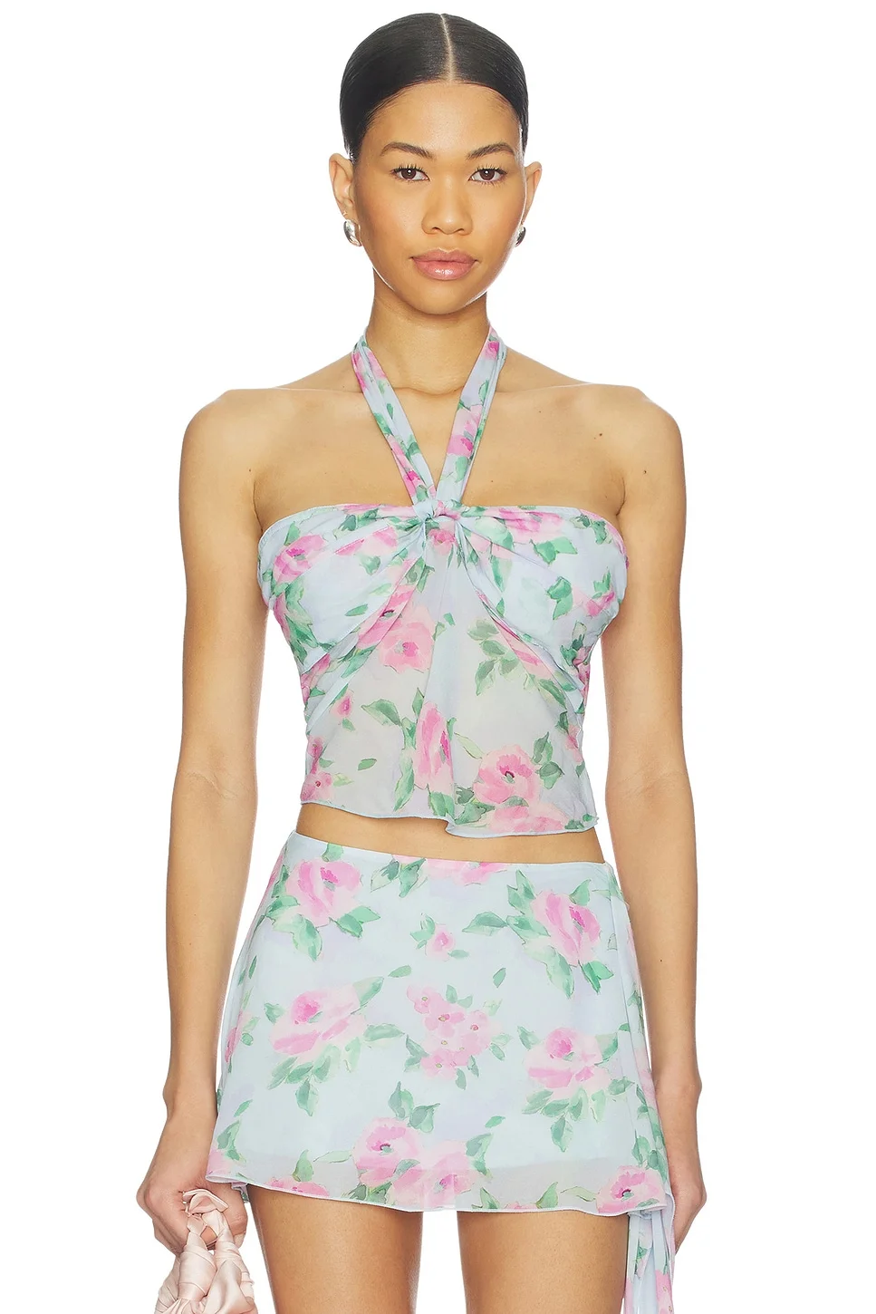 - Shell: 100% viscose Lining: 88% polyester 12% spandex - Dry clean recommended - Halter tie closure - Bandeau with thin tieback styling - Elastic shirring at back - Revolve Style No. FRBI-WS118 - Manufacturer Style No. 33302CK