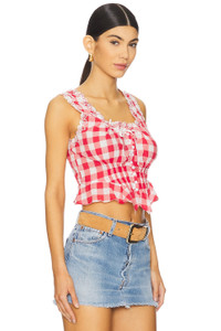 - Frankies Bikinis X Bella Hadid 100% cotton - Made in China - Dry clean only - Front button closure with self-tie closure at neckline - Cropped styling - Lightweight gauze fabric with eyelet trim - Revolve Style No. FRBI-WS80 - Manufacturer Style No. 33240CG