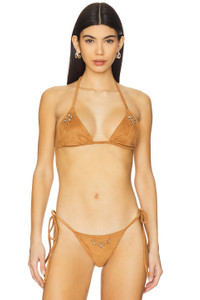 - Frankies Bikinis x Bella Hadid Self: 90% polyester 10% spandex Lining: 80% nylon 20% spandex - Made in China - Hand wash - Unpadded cups - Halterneck and back tie closure - Embellished stone accents - Lightweight faux suede fabric - Item not sold as a set - Revolve Style No. FRBI-WX1318 - Manufacturer Style No. 10500SD