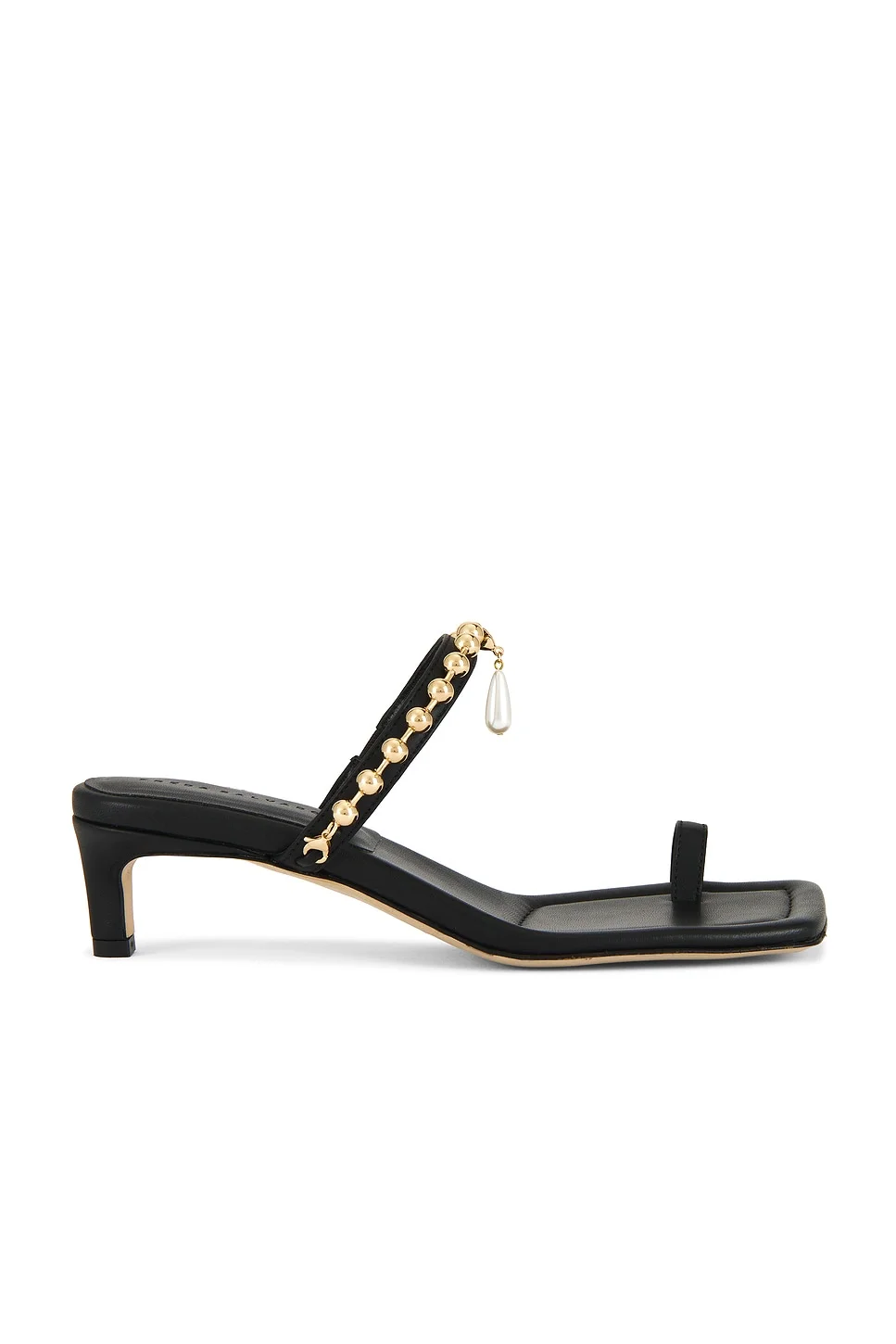 - Leather upper with manmade sole - Slip-on styling - Detachable gold-tone metal chain with faux pearl accent - Square toe - Approx 45mm/ 1.75 inch heel - Revolve Style No. FDAX-WZ51 - Manufacturer Style No. AURORA