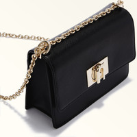 Crafted from luxurious printed leather with a grained finish, this elegant Furla 1927 mini bag is perfectly sized to hold your small essentials and personal effects. Wear it on the shoulder or crossbody, either way you're sure to turn heads with this stylish accessory. - Open inside pocket for credit cards and documents - Open outer pocket on the back - Fixed chain shoulder strap with adjustable matching leather sections - Twist closure with Arch logo Details Interior Details: 1 Flat Open Pocket Exterior Details: 1 Open Pocket On The Back Material: Textured Leather Strap information: Fixed/Adjustable Chain Strap With Leather Parts Closure: Arch Turnlock Closure Edges: Tone-on-tone Seams: Tone-on-tone Product Code: BAFKACOARE0001007O6000 Internal Composition: 100% Polyester External Composition: 100% Leather Plating: Gold Dimensions in INCH 7,87 x 5,31 x 2,76 (w x h x d)