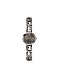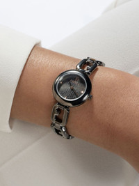 Analog Arco Chain 25mm Highlights - Dark grey dial - Gunmetal grey colour - Round case shape - 25mm case size - Rose gold coloured features on dial - Gunmetal bezel - Quartz movement - Concealed crown - This item comes with a standard one-year warranty from the boutique. Imported SIZE & FIT Measurement DIAMETER 0.98 in(2.5 cm)