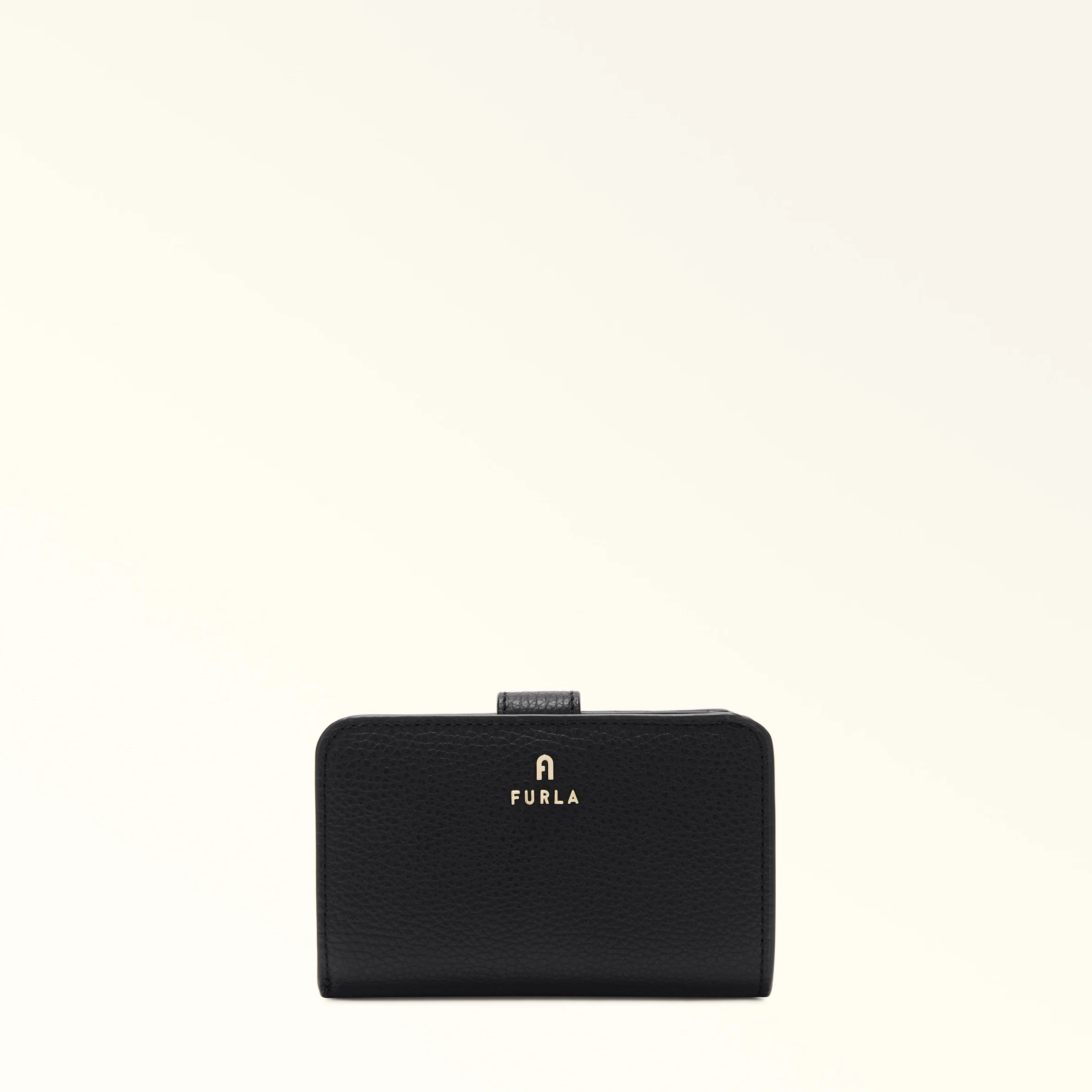 The minimalist design of this Furla Camelia compact wallet makes it the ideal choice to keep in every bag. The inside is designed especially to hold banknotes, cards and ID, and it is crafted from soft grained leather, featuring rounded corners and elegant lines. - Ten inner credit card slots - Inner compartment for banknotes - Four inner side pockets - Inner zipped coin pocket - Press-stud closure - Mini Furla and Arch logo punched on the front Interior Details 10 Cc Slots/4 Lateral Pockets/1 Large Compartment/Pocket With Zip For Coins material Grained Calf Leather Closure Snap Button Closure Hardware Arch+Furla Lettering / Metal Zip Puller product code WP00314_HSF000_1007_O6000 Lining 100% Viscose composition 100% Leather Plating Gold