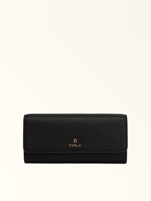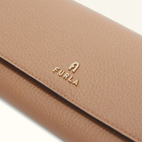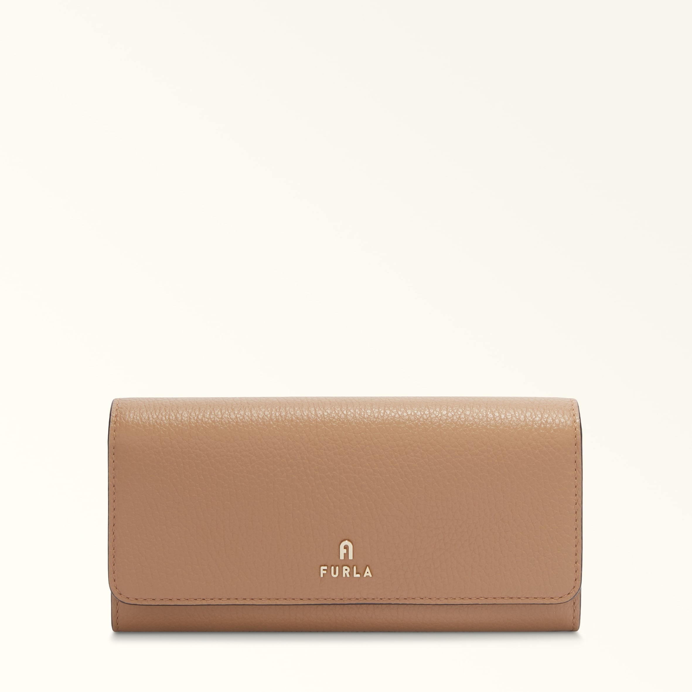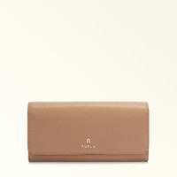 Styled in printed textured leather for a rich and luxurious feel, this Furla Camelia continental wallet features an elegant design, opening to reveal inner compartments and slots for banknotes, cards and coins. - Twelve inner credit card slots - Three inner compartments for banknotes - Two large inner side pockets - Inner zipped coin pocket - Open outer pocket on the back panel - Flap and press-stud closure - Mini Furla and Arch logo punched on the front Details Interior Details: 12 Cc Slots/3 Banknotes Pockets/2 Large Compartments/1 Divider With Zipped Pocket For Coins Exterior Details: Flat Open Pocket On Back Panel Material: Grained Calf Leather Closure: Snap Button Closure Hardware: Arch+Furla Lettering Product Code: WP00317HSF0001007YU500 Internal Composition: 100% Viscose External Composition: 100% Leather Plating: Gold Dimensions in INCH 7,68 x 3,74 x 0,98 (w x h x d)
