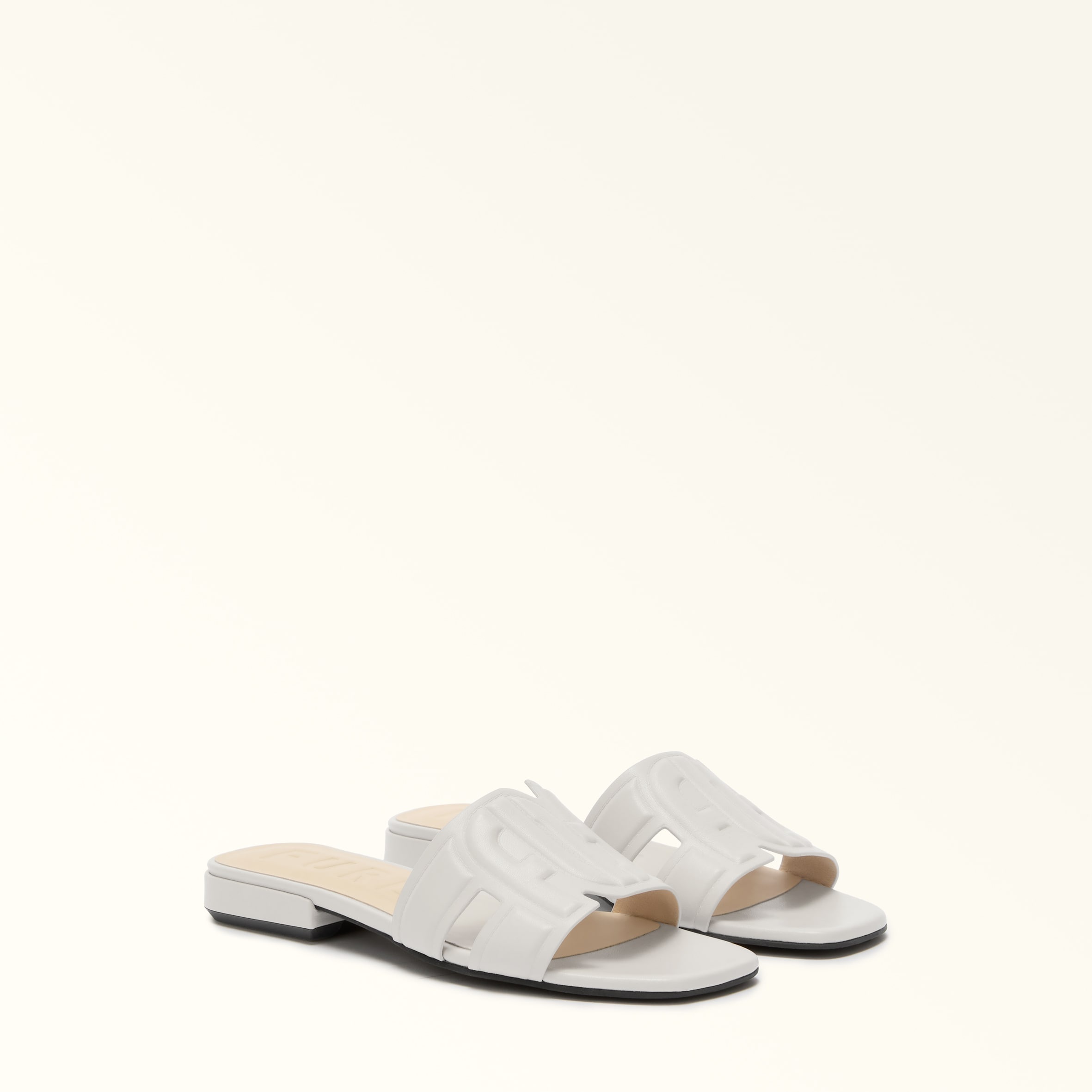 Furla Summer is the perfect flat mule for summer. This single-band model features a raised double Arch logo on the upper at the front. The shoe is complete with a comfortable insole customised with the brand signature. - 1 cm heel Details Interior Details: Synthetic lining Exterior Details: Furla Logo Embossed Material: Smooth Leather Heel Height: 0.39 in Sole Material: Rubber Heel Typology: Flat Shoe tip: OPEN TOE Product Code: YJ34SUMX3000044011704S Internal Composition: 72% Nylon 20% Ovis Aries Leather 8% Polyurethane External Composition: 100% Ovis Aries Leather Plating: Basic Model