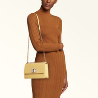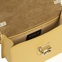 Crafted from luxurious printed leather with a grained finish, this elegant Furla 1927 mini bag is perfectly sized to hold your small essentials and personal effects. Wear it on the shoulder or crossbody, either way you're sure to turn heads with this stylish accessory. - Open inside pocket for credit cards and documents - Open outer pocket on the back - Fixed chain shoulder strap with adjustable matching leather sections - Twist closure with Arch logo Details Interior Details: 1 Flat Open Pocket Exterior Details: 1 Open Pocket On The Back Material: Textured Leather Strap information: Fixed/Adjustable Chain Strap With Leather Parts Closure: Arch Turnlock Closure Edges: Tone-on-tone Seams: Tone-on-tone Product Code: BAFKACOARE0001007MIM00 Internal Composition: 100% Polyester External Composition: 100% Leather Plating: Gold Dimensions in INCH 7,87 x 5,31 x 2,76 (w x h x d)