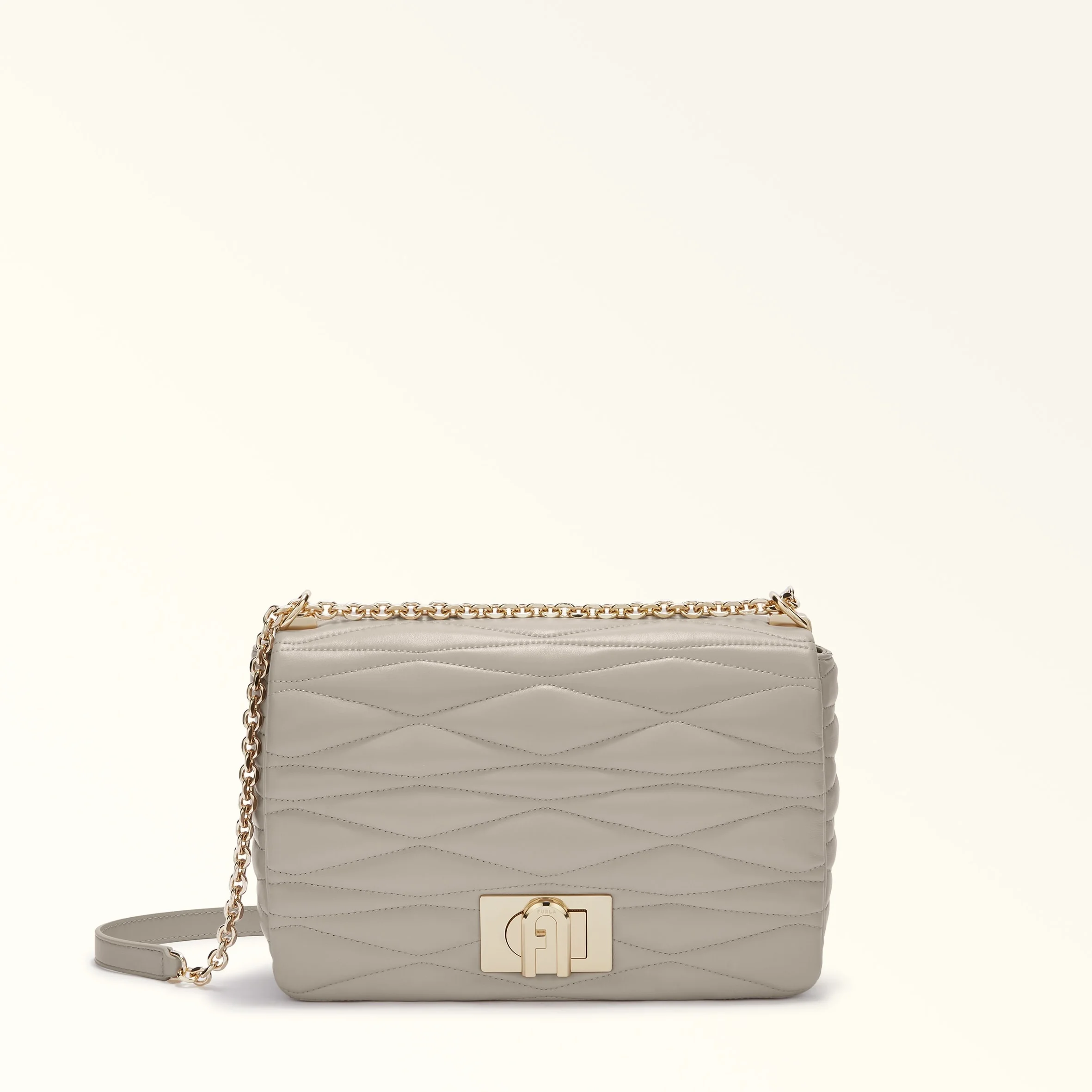 This Furla 1927 crossbody bag is elevated by soft woven nappa leather reminiscent of artisanal wicker. Its compact silhouette features a chain strap with adjustable matching leather inserts for a range of styling options. A twist lock closure decorated with the brand's iconic Arch logo adds a radiant finishing touch. - Two open inside pockets - Inside zip pocket Details Interior Details: 1 Zipped Pocket Material: Quilted Nappa Dattero Lux Calf Leather Strap information: Fixed/Adjustable Chain Strap With Leather Parts Strap Length Max: 41.73 in Strap Length Min: 41.73 in Closure: Arch Turnlock Closure Product Code: WB01672BX32211007VAN00 Internal Composition: 100% Polyester External Composition: 100% Ovis Aries Leather Plating: Gold Dimensions in INCH 11,02 x 7,09 x 2,95 (w x h x d)