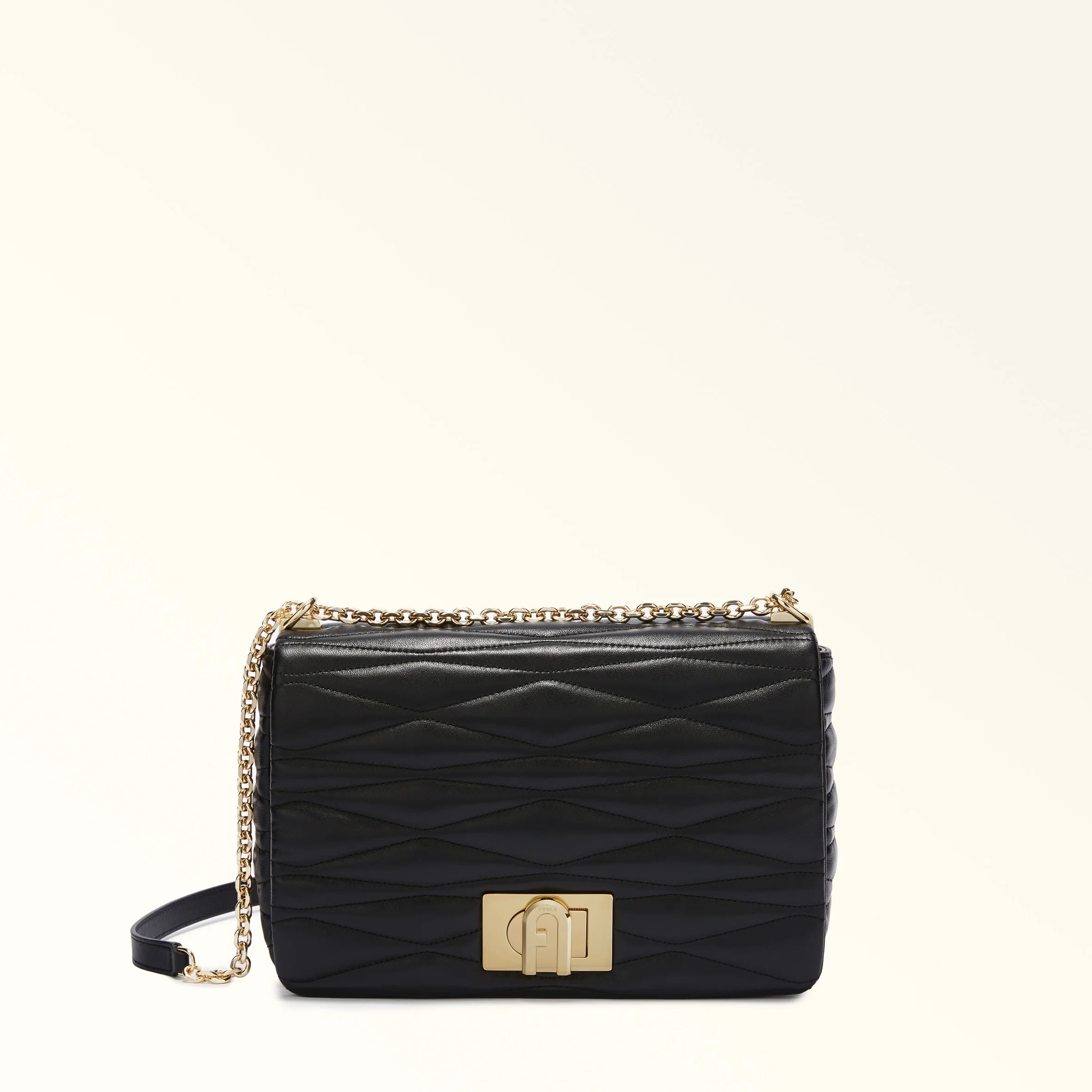 This Furla 1927 crossbody bag is elevated by soft woven nappa leather reminiscent of artisanal wicker. Its compact silhouette features a chain strap with adjustable matching leather inserts for a range of styling options. A twist lock closure decorated with the brand's iconic Arch logo adds a radiant finishing touch. - Two open inside pockets - Inside zip pocket Details Interior Details: 1 Zipped Pocket Material: Quilted Nappa Dattero Lux Calf Leather Strap information: Fixed/Adjustable Chain Strap With Leather Parts Strap Length Max: 41.73 in Strap Length Min: 41.73 in Closure: Arch Turnlock Closure Product Code: WB01672BX32211007O6000 Internal Composition: 100% Polyester External Composition: 100% Ovis Aries Leather Plating: Gold Dimensions in INCH 11,02 x 7,09 x 2,95 (w x h x d)