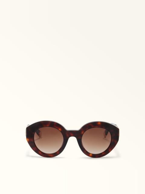 The SFU987 Furla Sunglasses feature a rounded, acetate silhouette. Their bold frame is embellished by the Nuvola Arch detail on the temple sides. - Furla logo plaque on the temple tips - Gradient lenses - Suitable for prescription lenses Details Material: Acetate Frame Material: Acetate Lense Color: Gradient Brown Lense Material: Polyester Cr39 Sunglasses Shape: Round UV protection: cat. 3 Product Code: WD00157AX01164401AN000 Plating: Basic Model Temple: 5.51 in Bridge: 1.02 in Calibre: 1.89 in