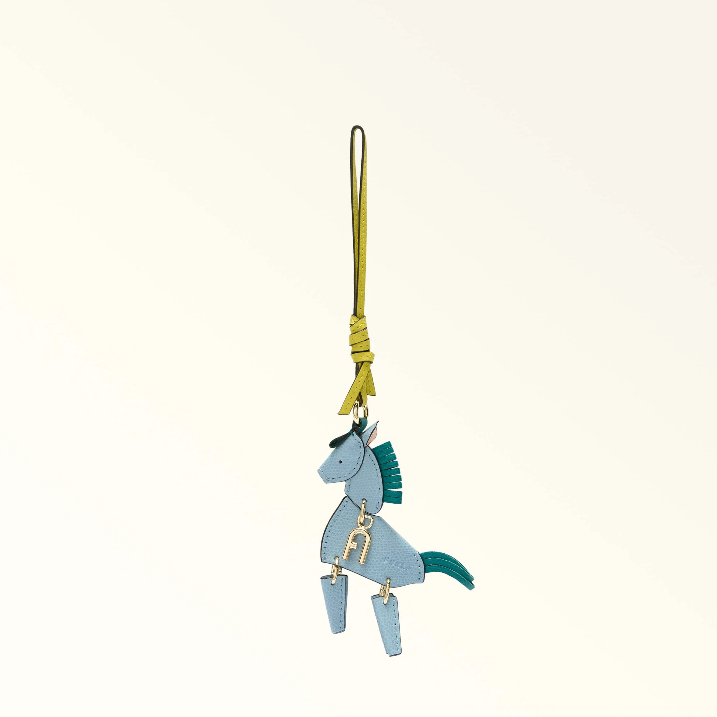 This Furla Allegra keyring comes in the shape of a small articulated horse, made of leather with contrasting colour-block details. A decorative accessory for embellishing your bag or corralling your keys, it adds a fun touch to any look. - Thin strap in leather - Six small metal rings - Metal ring - Printed Furla logo Details Exterior Details: Furla Punched Logo Material: Textured Leather Product Code: WK00555ACO00010074500S Plating: Gold Dimensions in INCH 3,15 x 10,63 (w x h)