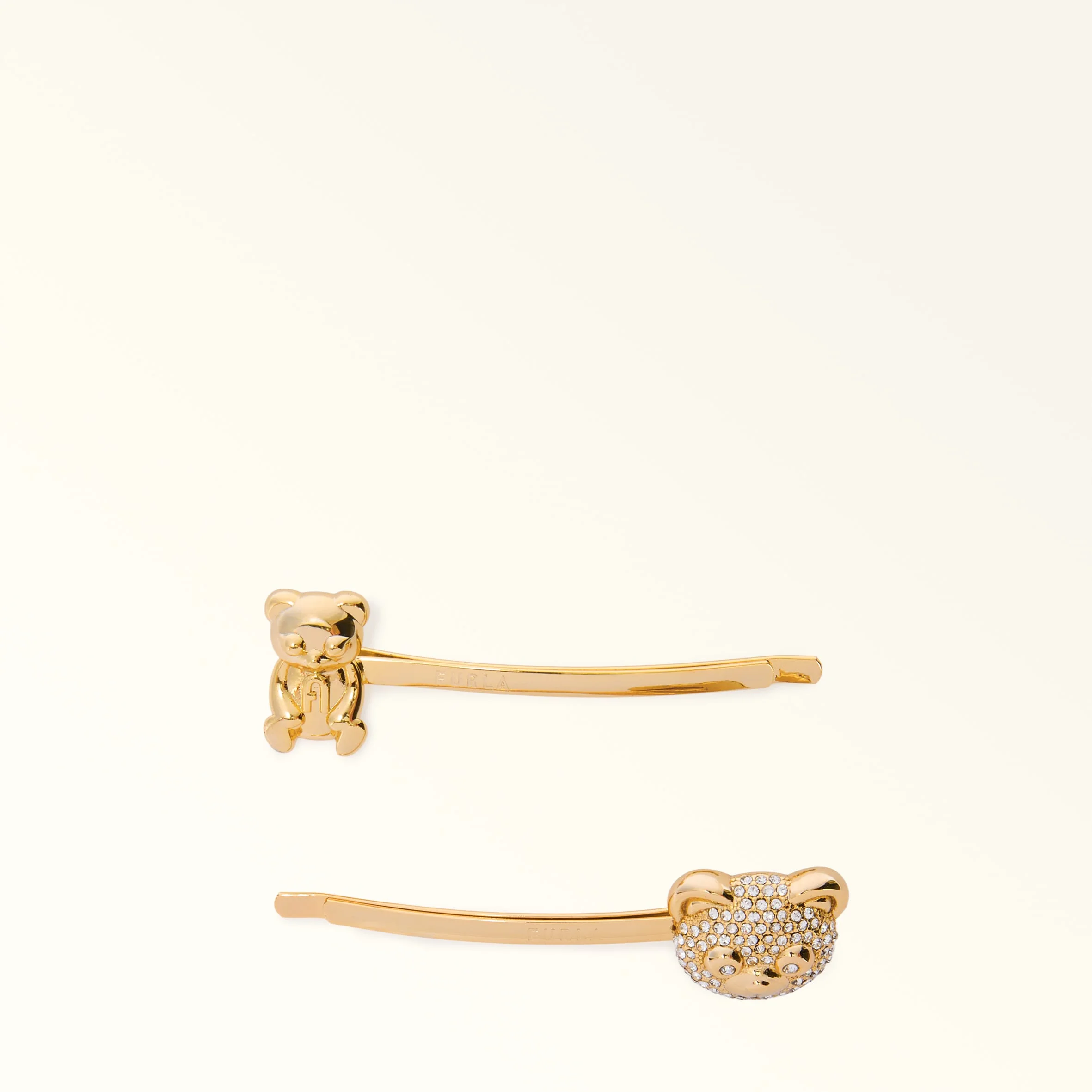 With a playful charm, the metal Furla Allegra grips are embellished with a little teddy bear and a teddy-bear head set with sparkling rhinestones. Effortless to wear, they lend a touch of originality to any hairstyle. Details Material: Metal + Strass Product Code: WH00107K210001007CGD00 Plating: Gold