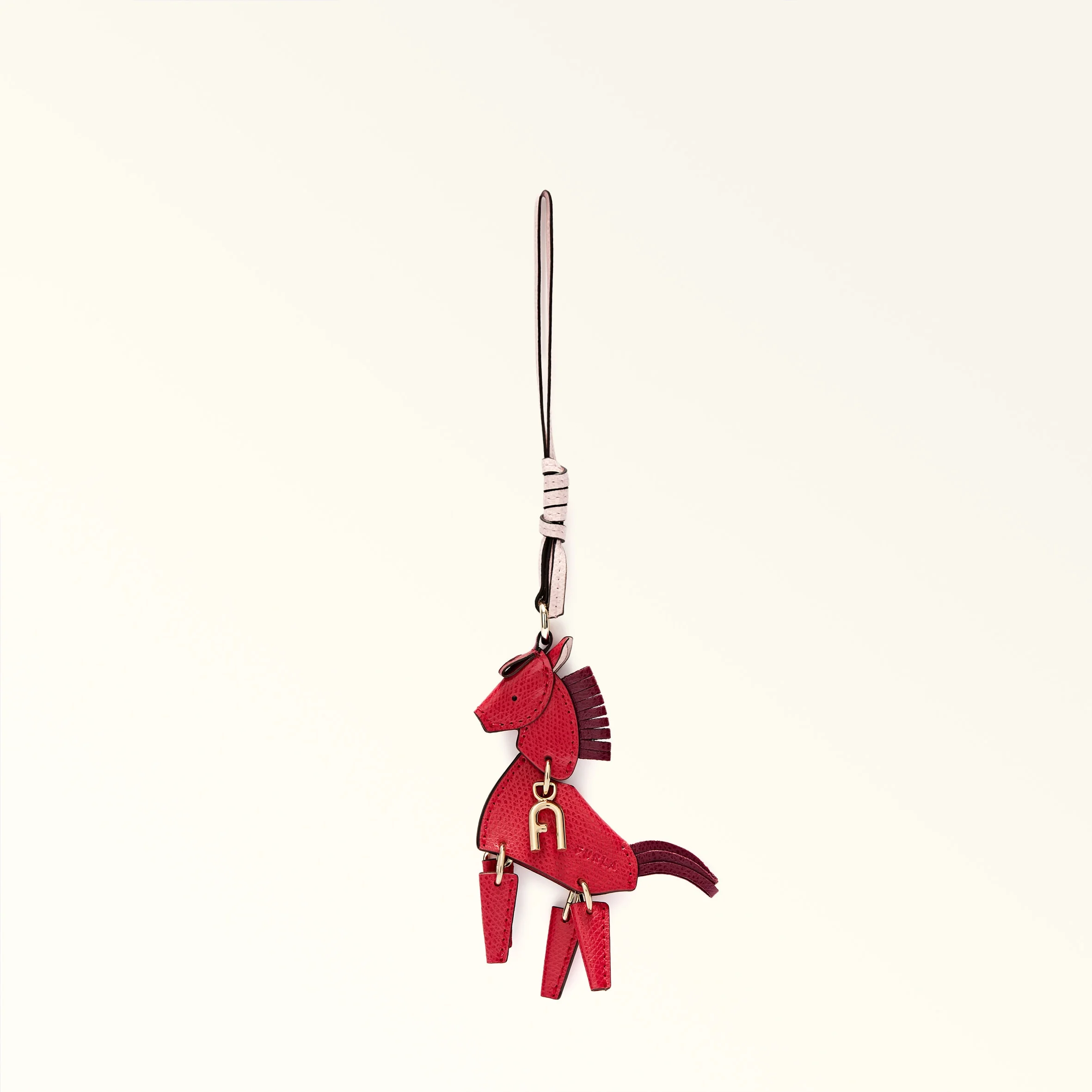 This Furla Allegra keyring comes in the shape of a small articulated horse, made of leather with contrasting colour-block details. A decorative accessory for embellishing your bag or corralling your keys, it adds a fun touch to any look. - Thin strap in leather - Six small metal rings - Metal ring - Printed Furla logo Details Exterior Details: Furla Punched Logo Material: Textured Leather Product Code: WK00555ACO0001007TRB00 Plating: Gold Dimensions in INCH 3,15 x 10,63 (w x h)