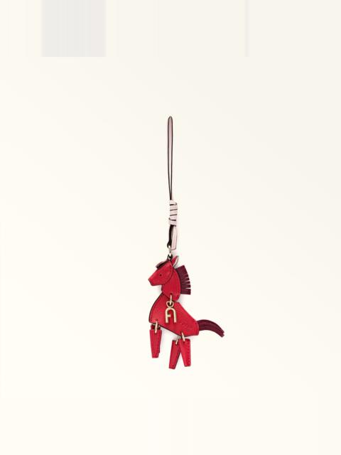 This Furla Allegra keyring comes in the shape of a small articulated horse, made of leather with contrasting colour-block details. A decorative accessory for embellishing your bag or corralling your keys, it adds a fun touch to any look. - Thin strap in leather - Six small metal rings - Metal ring - Printed Furla logo Details Exterior Details: Furla Punched Logo Material: Textured Leather Product Code: WK00555ACO00010074525S Plating: Gold Dimensions in INCH 3,15 x 10,63 (w x h)