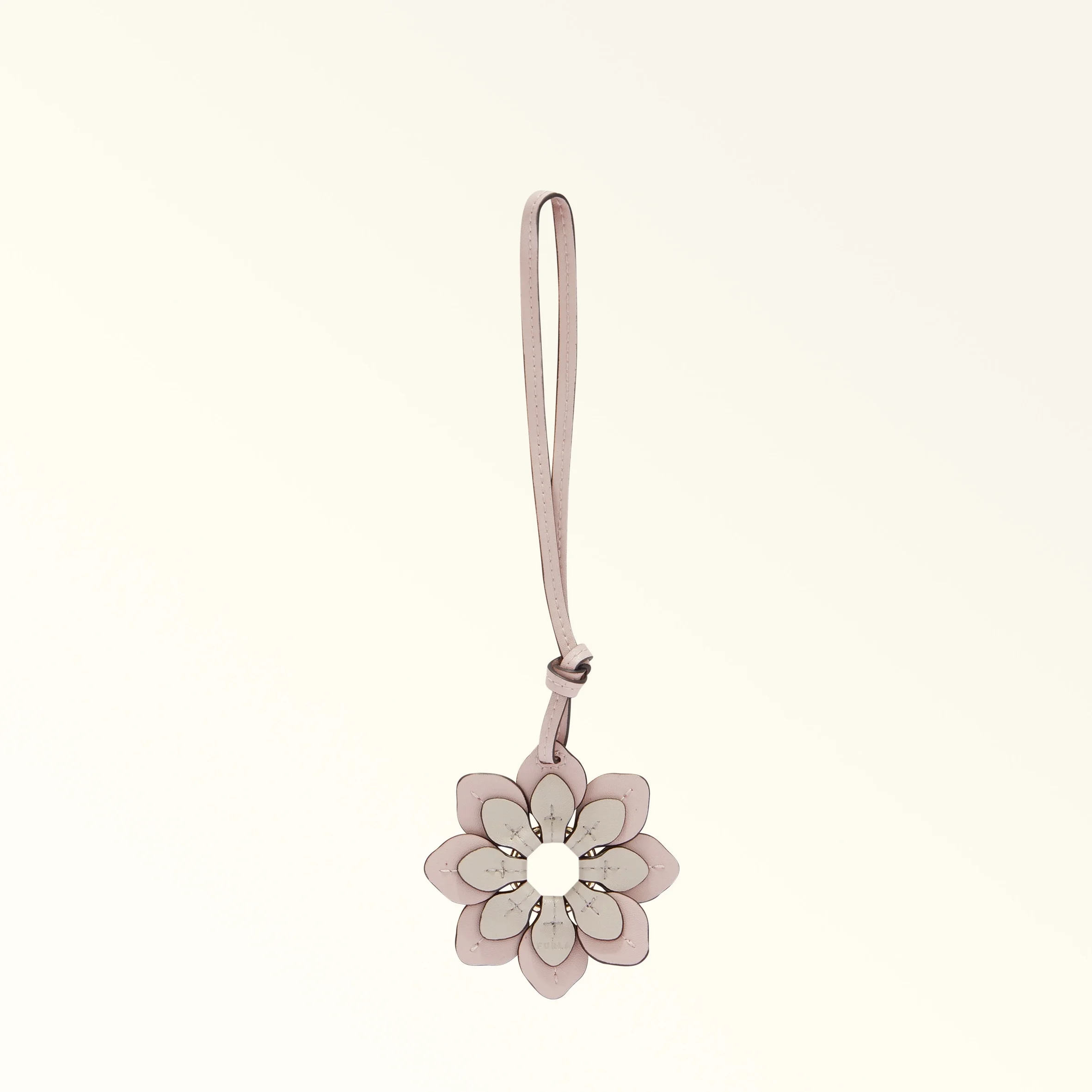 This Furla Allegra keyring is crafted in printed leather with a distinctive two-tone chromatic effect, and features an exclusive spring version of a camellia flower. A decorative accessory for embellishing your bag or keeping your keys handy, it adds a fun touch to any look. - Slim matching leather strap - Furla logo printed on the back Details Material: Bicolor Sidney Calf Leather Product Code: WK00234BX335910072840S External Composition: 100% Leather Plating: Gold