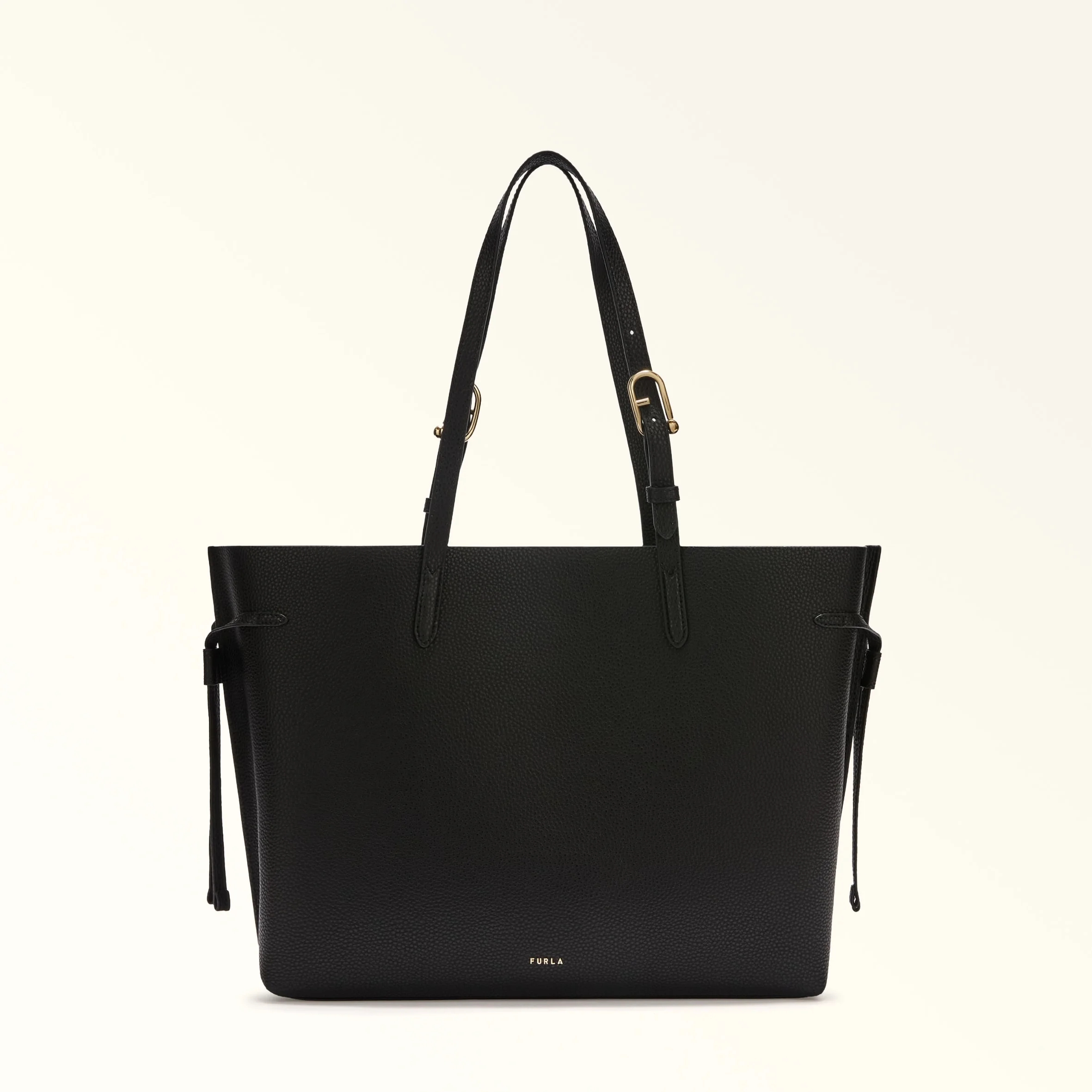 The Furla Ava tote bag is crafted from elegant reversible calfskin with a contrasting colour-block reverse. Its large silhouette features a spacious interior with plenty of room for all your essentials. It can be worn on the shoulder or as a top-handle bag with its two long handles, adjustable using the Arch logo hardware. - Open inside pocket - Two large open compartments - Inner divider with zip - Embossed Furla logo Details Interior Details: 1 Zipped Divider 2 Compartments Flat Open Pockets Material: Double Pebble Calf Leather Closure: Open Top Bag Product Code: WB02001BX432910073924S Plating: Gold Dimensions in INCH 14,37 x 11,61 x 5,31 (w x h x d)