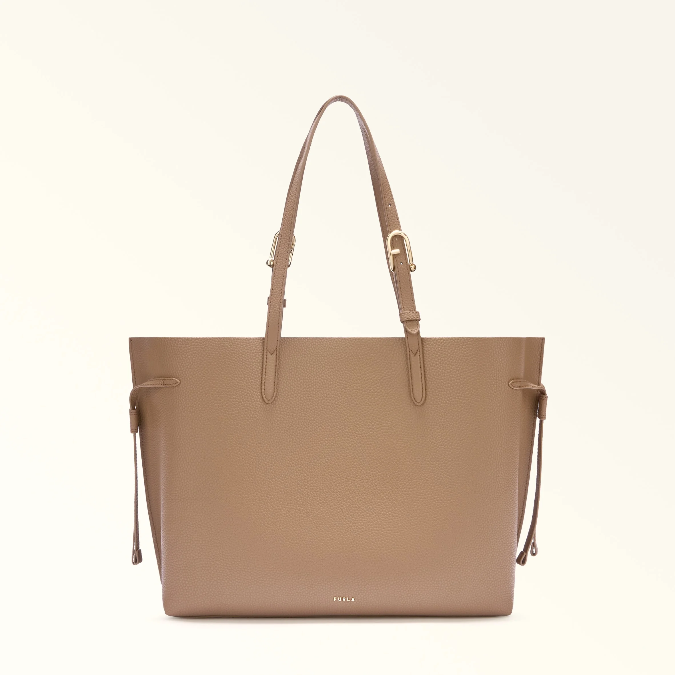 The Furla Ava tote bag is crafted from elegant reversible calfskin with a contrasting colour-block reverse. Its large silhouette features a spacious interior with plenty of room for all your essentials. It can be worn on the shoulder or as a top-handle bag with its two long handles, adjustable using the Arch logo hardware. - Open inside pocket - Two large open compartments - Inner divider with zip - Embossed Furla logo Details Interior Details: 1 Zipped Divider 2 Compartments Flat Open Pockets Material: Double Pebble Calf Leather Closure: Open Top Bag Product Code: WB02001BX432910074619S Plating: Gold Dimensions in INCH 14,37 x 11,61 x 5,31 (w x h x d)