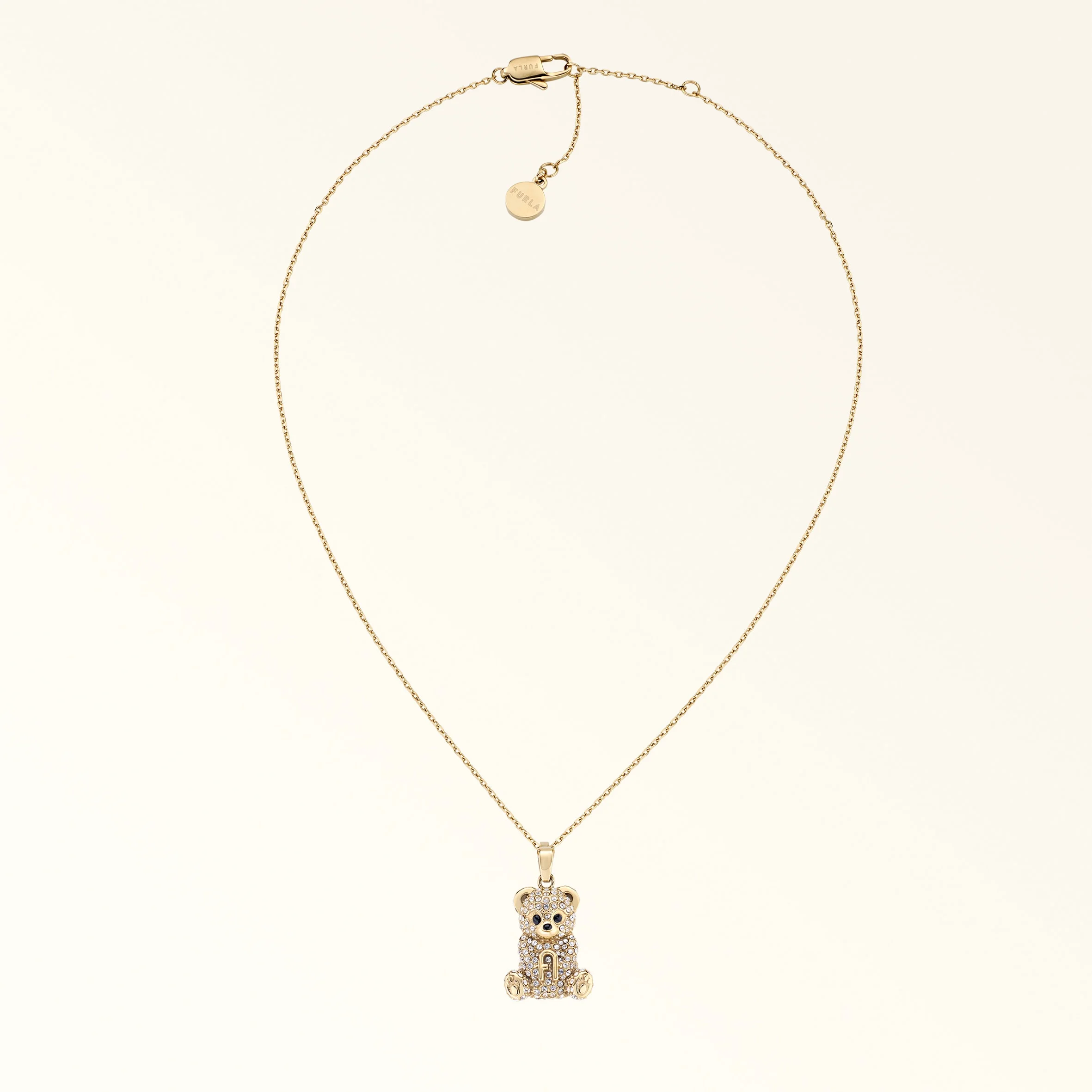 The Furla Bazaar necklace is sweet and sophisticated, featuring a dainty adjustable chain and an eye-catching rhinestone teddy bear. Its design is finished with the brand's iconic Arch logo. - Snap hook closure Details Material: Metal + Strass Product Code: WJ00279K210001007OR000 Plating: Gold