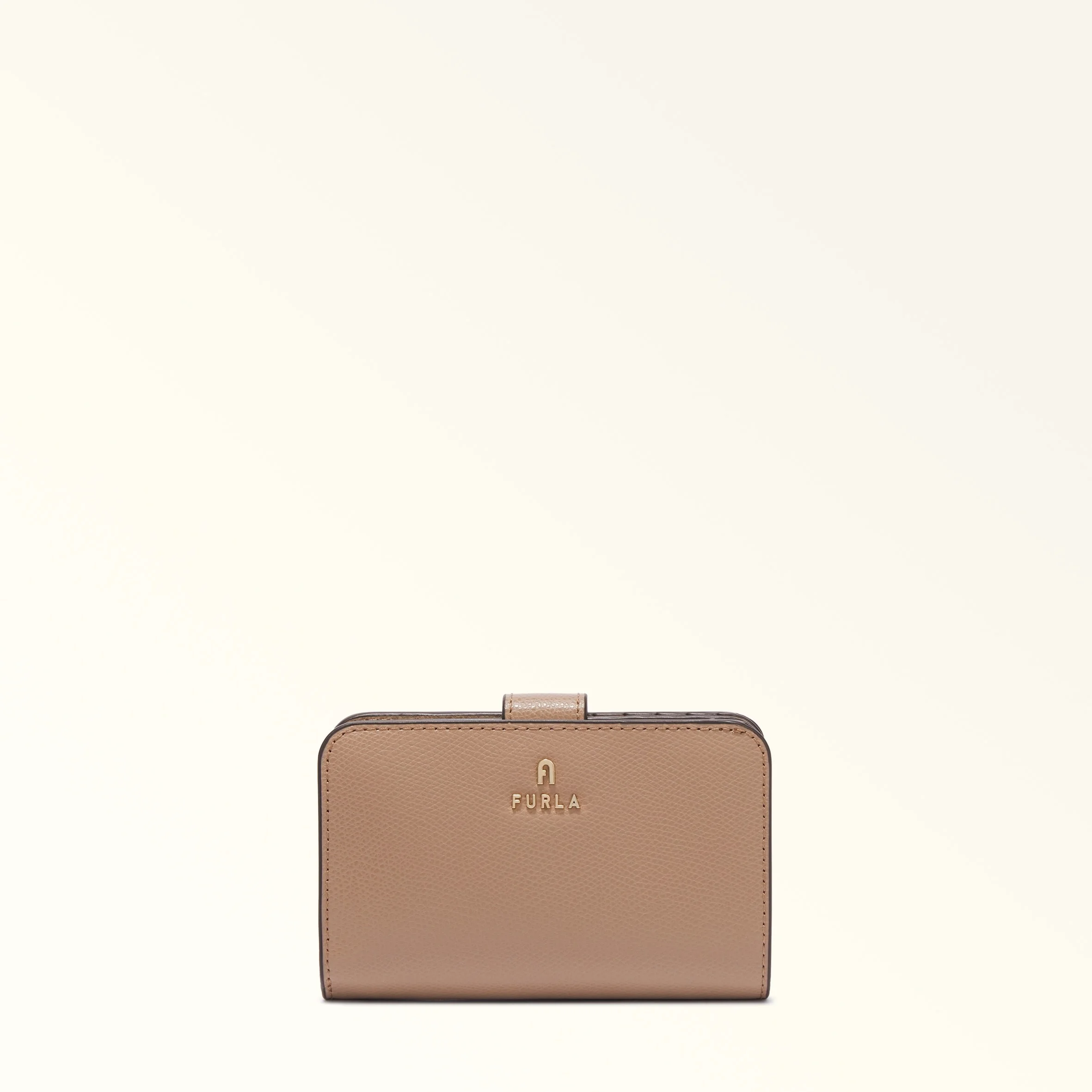 The minimalist design of this Furla Camelia compact wallet makes it the ideal choice to keep in every bag. The inside is designed especially to hold banknotes, cards and ID, and it is crafted from smooth leather, featuring rounded corners and elegant lines. - Ten inner credit card and slots - Inner compartment for banknotes - Four inner side pockets - Inner zipped coin pocket - Flap and press-stud closure - Mini Furla and Arch logo punched on the front Details Interior Details: 10 Cc Slots/4 Lateral Pockets/1 Large Compartment/Pocket With Zip For Coins Material: Textured Leather Closure: Snap Button Closure Hardware: Arch+Furla Lettering / Metal Zip Puller Product Code: WP00314ARE00010071257S Internal Composition: 100% Viscose External Composition: 100% Leather Plating: Gold Dimensions in INCH 5,51 x 3,54 x 1,2 (w x h x d)