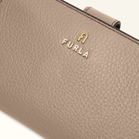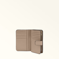 The minimalist design of this Furla Camelia compact wallet makes it the ideal choice to keep in every bag. The inside is designed especially to hold banknotes, cards and ID, and it is crafted from soft grained leather, featuring rounded corners and elegant lines. - Ten inner credit card slots - Inner compartment for banknotes - Four inner side pockets - Inner zipped coin pocket - Press-stud closure - Mini Furla and Arch logo punched on the front Details Interior Details: 10 Cc Slots/4 Lateral Pockets/1 Large Compartment/Pocket With Zip For Coins Material: Grained Calf Leather Closure: Snap Button Closure Hardware: Arch+Furla Lettering / Metal Zip Puller Product Code: WP00314HSF00010072572S Internal Composition: 100% Viscose External Composition: 100% Leather Plating: Gold Dimensions in INCH 5,51 x 3,54 x 1,2 (w x h x d)
