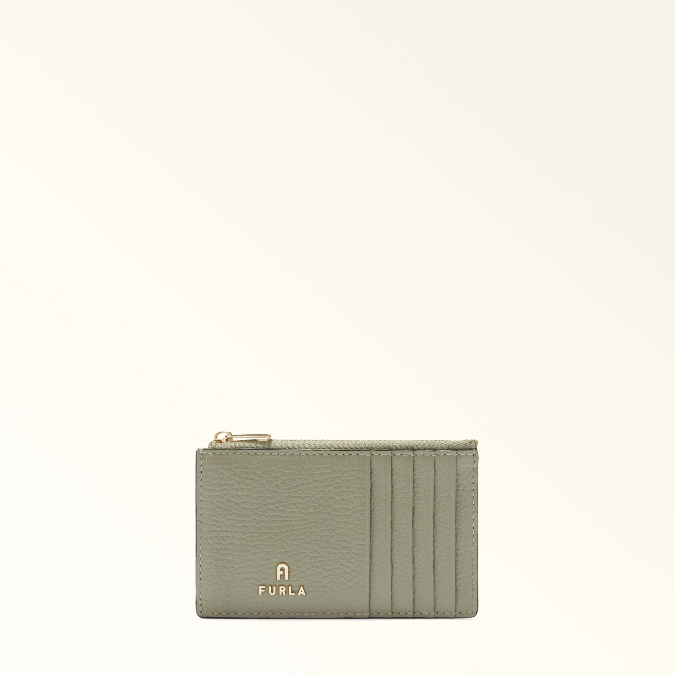 The elegant Furla Camelia cardholder in textured leather features a small, slim silhouette that can be slipped conveniently into any bag. - Five credit card slots on the front and back - Central inside pocket with zip closure - Zip closure - Mini Furla and Arch logo punched on the front Details Exterior Details: 5 Cc Slots On Front Panel/5 Cc Slots On The Back Panel/1 Central Zipped Pocket Material: Grained Calf Leather Hardware: Arch+Furla Lettering / Metal Zip Puller Product Code: WP00310HSF0001007AG700 Internal Composition: 100% Viscose External Composition: 100% Leather Plating: Gold Dimensions in INCH 5,12 x 3,15 (w x h)