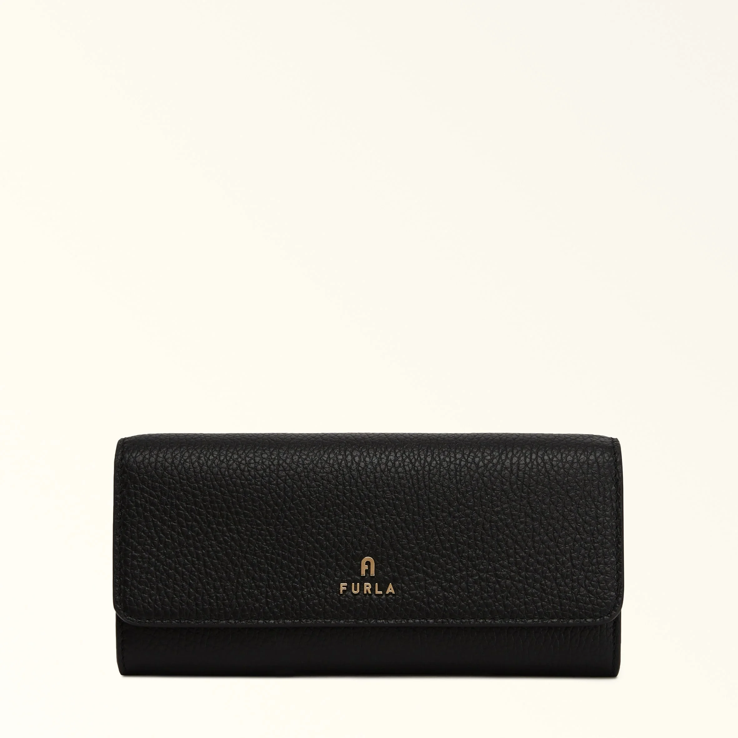 Styled in printed textured leather for a rich and luxurious feel, this Furla Camelia continental wallet features an elegant design, opening to reveal inner compartments and slots for banknotes, cards and coins. - Twelve inner credit card slots - Three inner compartments for banknotes - Two large inner side pockets - Inner zipped coin pocket - Open outer pocket on the back panel - Flap and press-stud closure - Mini Furla and Arch logo punched on the front Details Interior Details: 12 Cc Slots/3 Banknotes Pockets/2 Large Compartments/1 Divider With Zipped Pocket For Coins Exterior Details: Flat Open Pocket On Back Panel Material: Grained Calf Leather Closure: Snap Button Closure Hardware: Arch+Furla Lettering Product Code: WP00317HSF0001007O6000 Internal Composition: 100% Viscose External Composition: 100% Leather Plating: Gold Dimensions in INCH 7,68 x 3,74 x 0,98 (w x h x d)