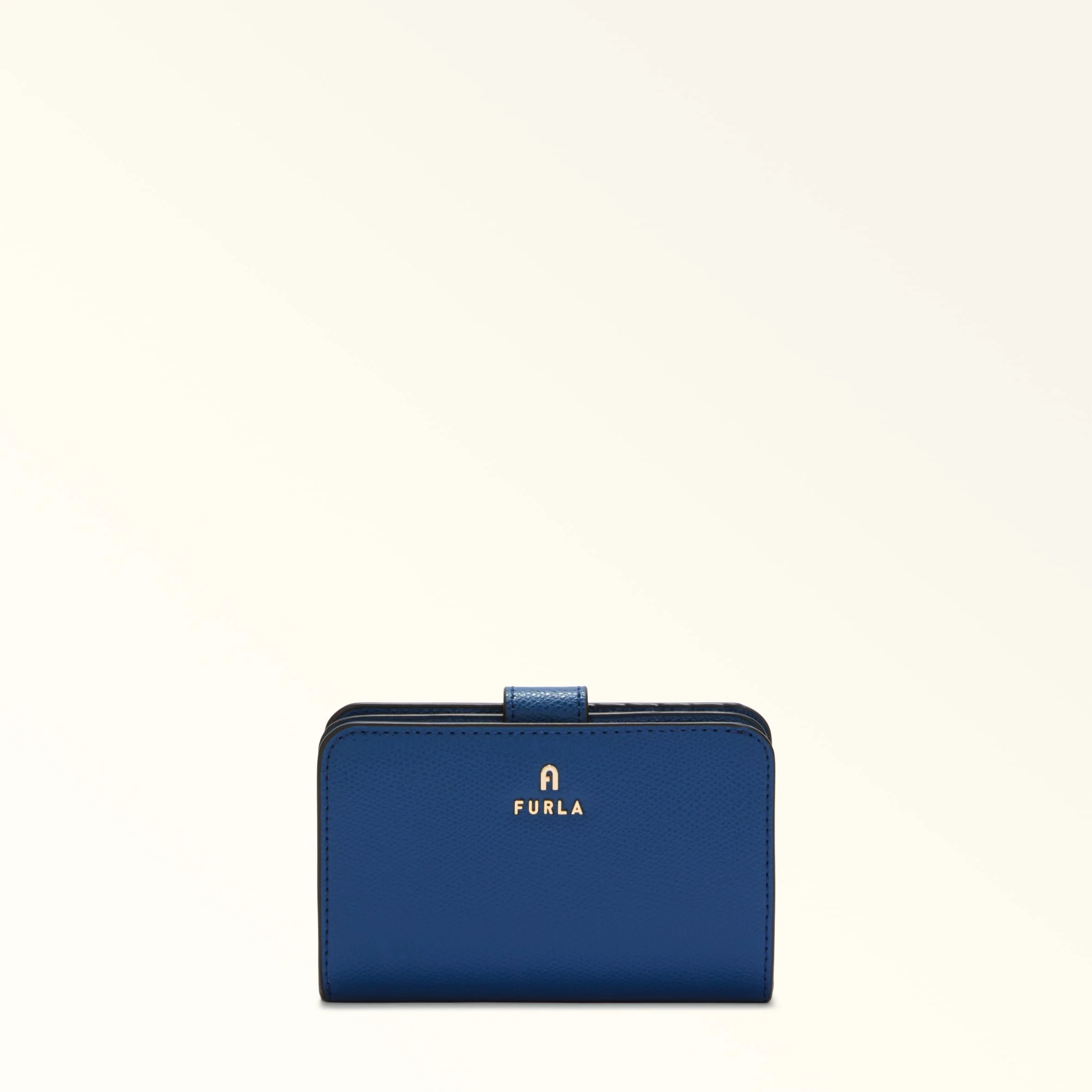 The minimalist design of this Furla Camelia compact wallet makes it the ideal choice to keep in every bag. The inside is designed especially to hold banknotes, cards and ID, and it is crafted from smooth leather, featuring rounded corners and elegant lines. - Ten inner credit card and slots - Inner compartment for banknotes - Four inner side pockets - Inner zipped coin pocket - Flap and press-stud closure - Mini Furla and Arch logo punched on the front Details Interior Details: 10 Cc Slots/4 Lateral Pockets/1 Large Compartment/Pocket With Zip For Coins Material: Textured Leather Closure: Snap Button Closure Hardware: Arch+Furla Lettering / Metal Zip Puller Product Code: WP00314ARE00010076G000 Internal Composition: 100% Viscose External Composition: 100% Leather Plating: Gold Dimensions in INCH 5,51 x 3,54 x 1,2 (w x h x d)