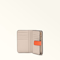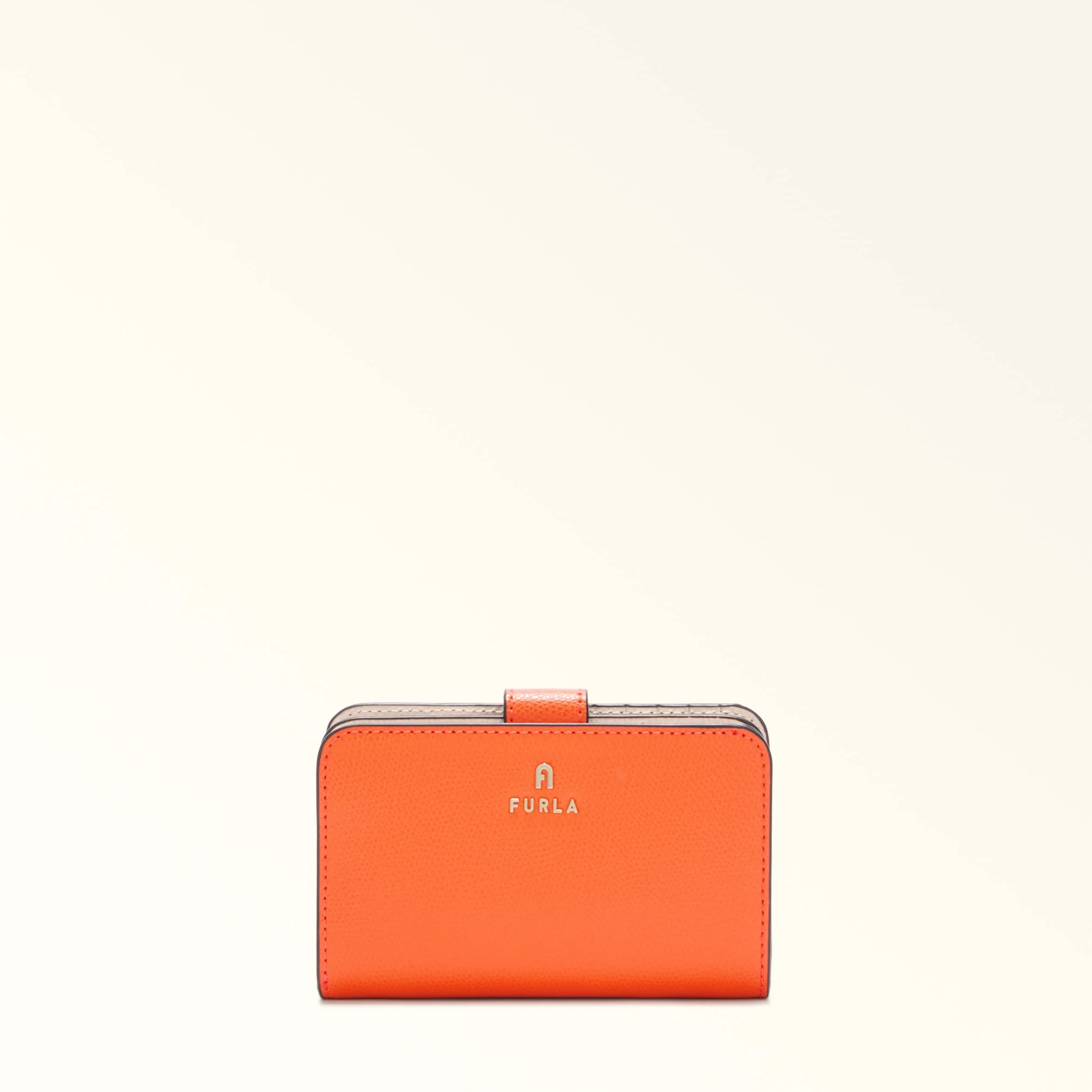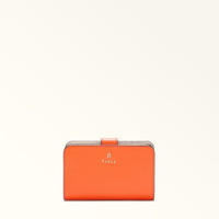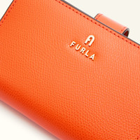 The minimalist design of this Furla Camelia compact wallet makes it the ideal choice to keep in every bag. The inside is designed especially to hold banknotes, cards and ID, and it is crafted from smooth leather, featuring rounded corners and elegant lines. - Ten inner credit card and slots - Inner compartment for banknotes - Four inner side pockets - Inner zipped coin pocket - Flap and press-stud closure - Mini Furla and Arch logo punched on the front Details Interior Details: 10 Cc Slots/4 Lateral Pockets/1 Large Compartment/Pocket With Zip For Coins Material: Textured Leather Closure: Snap Button Closure Hardware: Arch+Furla Lettering / Metal Zip Puller Product Code: WP00314ARE00010074058S Internal Composition: 100% Viscose External Composition: 100% Leather Plating: Gold Dimensions in INCH 5,51 x 3,54 x 1,2 (w x h x d)