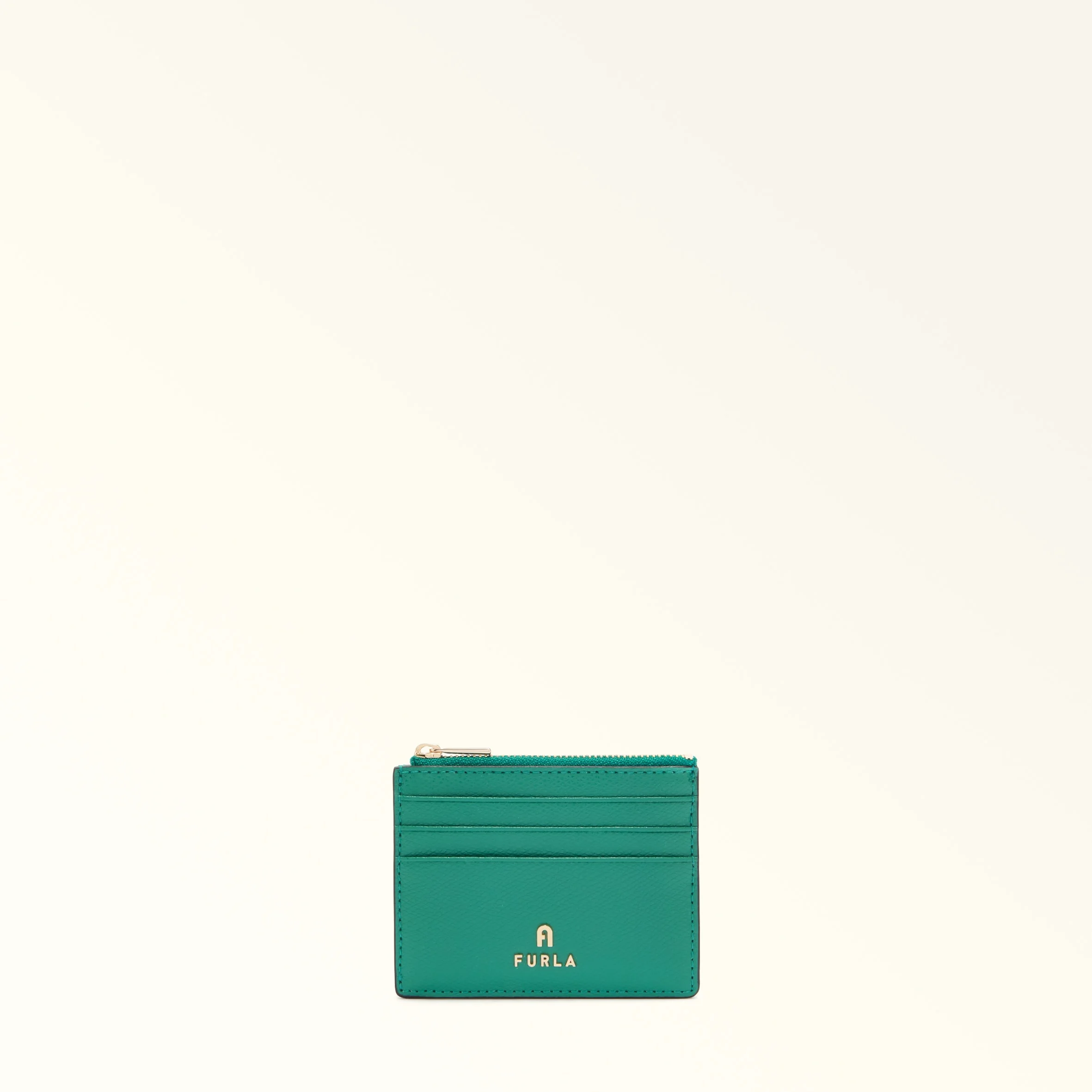 Keep your cards within easy reach with this stylish Furla Camelia card holder in printed textured leather. This compact design is ideal for keeping in any bag, and can also be used to hold cash, coins and receipts in the main compartment. - Three credit card slots on the front and back - Mini Furla and Arch logo punched on the front Details Exterior Details: 3 Cc Slots On Front Panel/3 Cc Slots On Back Panel Material: Textured Leather Closure: Zipper Hardware: Arch+Furla Lettering / Metal Zip Puller Product Code: WP00388ARE0001007JD000 Internal Composition: 100% Viscose External Composition: 100% Leather Plating: Gold Dimensions in INCH 4,13 x 3,35 x 0,59 (w x h x d)