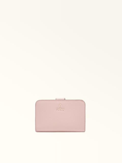 The minimalist design of this Furla Camelia compact wallet makes it the ideal choice to keep in every bag. The inside is designed especially to hold banknotes, cards and ID, and it is crafted from smooth leather, featuring rounded corners and elegant lines. - Ten inner credit card and slots - Inner compartment for banknotes - Four inner side pockets - Inner zipped coin pocket - Flap and press-stud closure - Mini Furla and Arch logo punched on the front Details Interior Details: 10 Cc Slots/4 Lateral Pockets/1 Large Compartment/Pocket With Zip For Coins Material: Textured Leather Closure: Snap Button Closure Hardware: Arch+Furla Lettering / Metal Zip Puller Product Code: WP00314ARE00010074504S Internal Composition: 100% Viscose External Composition: 100% Leather Plating: Gold Weight: 0.28 kg Dimensions in INCH 5,51 x 3,54 x 1,2 (w x h x d)