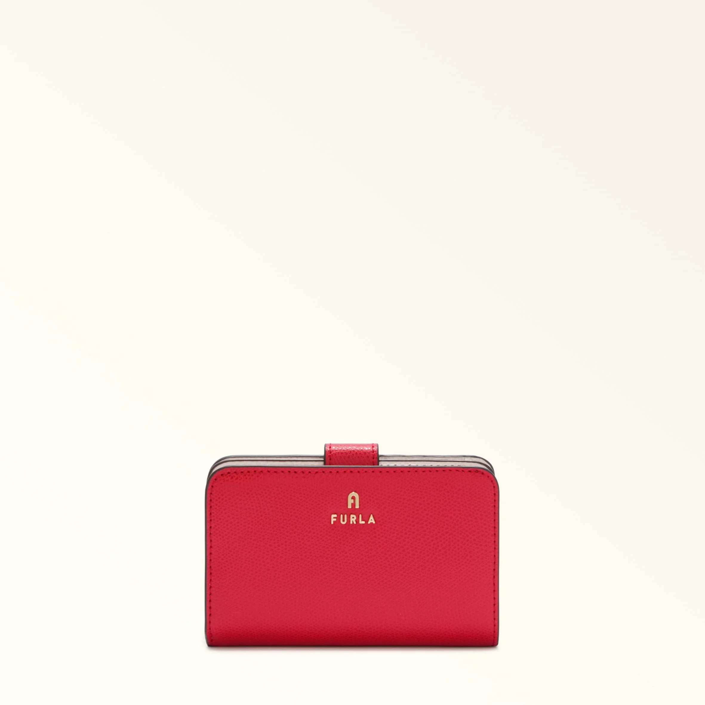 The minimalist design of this Furla Camelia compact wallet makes it the ideal choice to keep in every bag. The inside is designed especially to hold banknotes, cards and ID, and it is crafted from smooth leather, featuring rounded corners and elegant lines. - Ten inner credit card and slots - Inner compartment for banknotes - Four inner side pockets - Inner zipped coin pocket - Flap and press-stud closure - Mini Furla and Arch logo punched on the front Details Interior Details: 10 Cc Slots/4 Lateral Pockets/1 Large Compartment/Pocket With Zip For Coins Material: Textured Leather Closure: Snap Button Closure Hardware: Arch+Furla Lettering / Metal Zip Puller Product Code: WP00314ARE00010074305S Internal Composition: 100% Viscose External Composition: 100% Leather Plating: Gold Dimensions in INCH 5,51 x 3,54 x 1,2 (w x h x d)