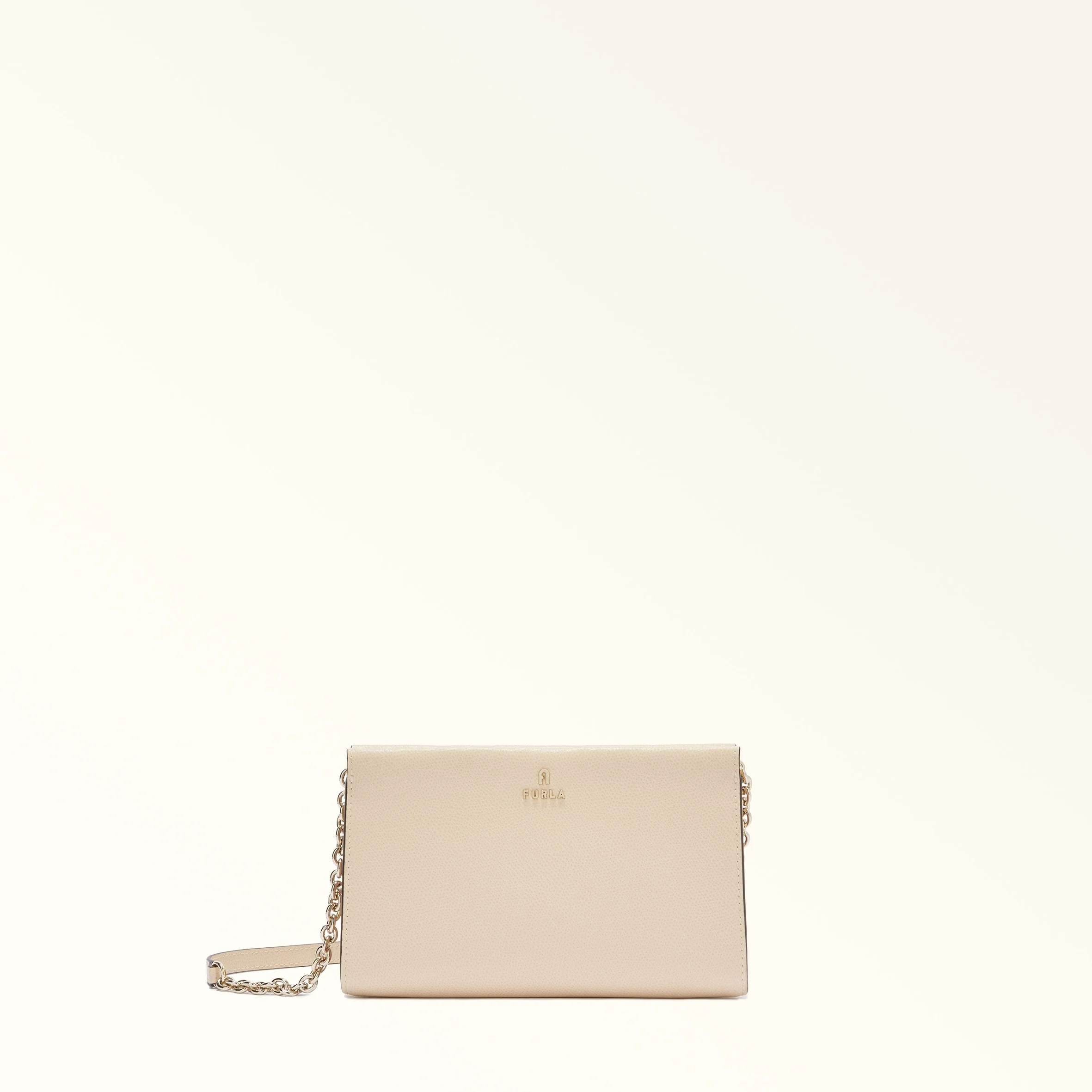 The sleek and understated design of this Furla Camelia mini crossbody bag features geometric lines, a rectangular shape and a rigid handle. Crafted in grained leather, this elegant and versatile piece can be carried as a clutch or worn crossbody, and is the ideal choice for stylishly holding all your essentials. - Twelve inner credit card slots - Chain shoulder strap with leather sections - Zip closure - Furla and Arch logo punched on the front Details Interior Details: 12 Cc Slots Material: Textured Leather Strap information: Fixed/Non Adjustable Chain Strap With Leather Parts Closure: Zipper Hardware: Arch Furla Lettering Metal Zip Puller Snap Button Product Code: WE00528ARE0001007B4L00 Internal Composition: 100% Polyester External Composition: 100% Leather Plating: Gold Dimensions in INCH 7,87 x 5,12 x 0,98 (w x h x d)