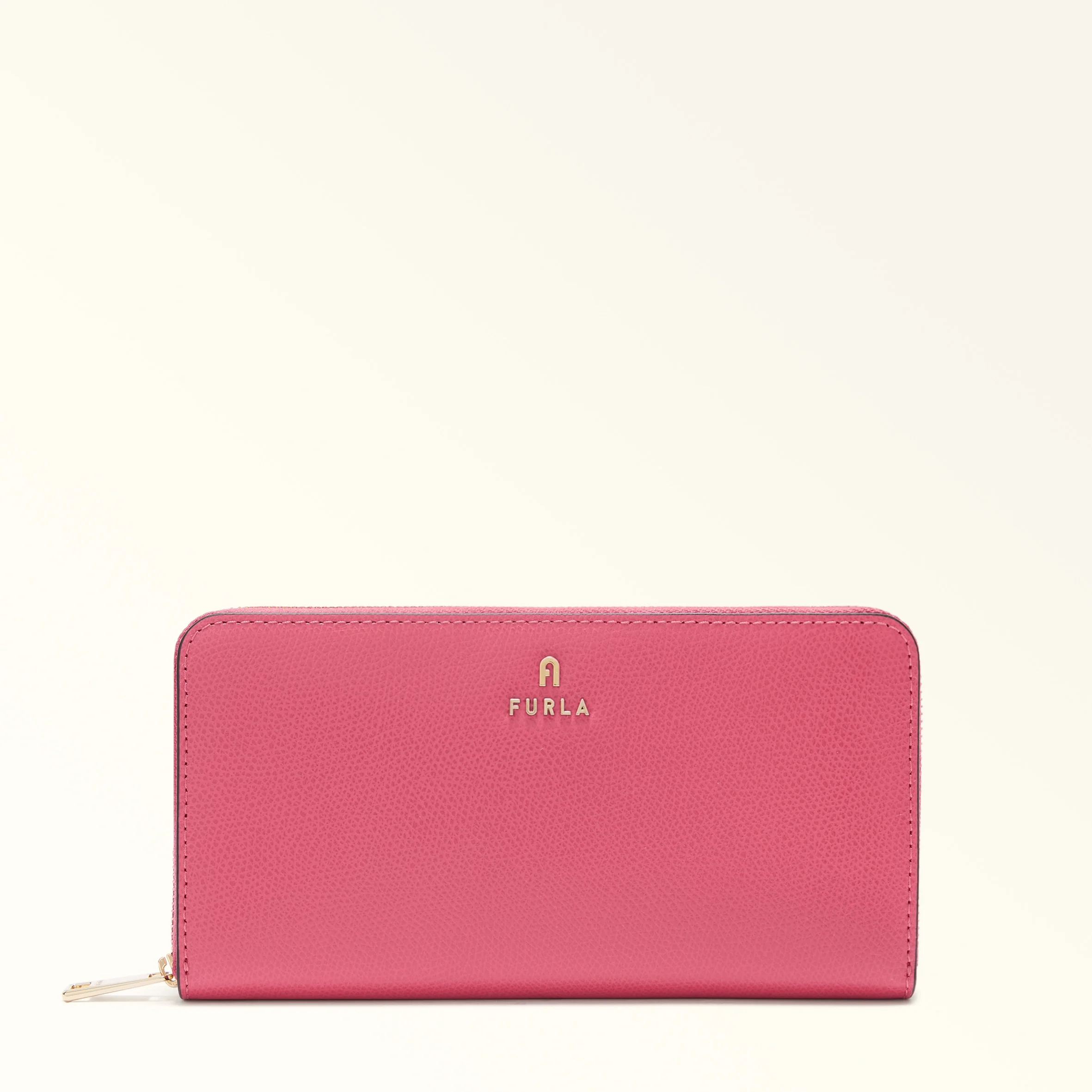 Keep your cards and cash perfectly organised with this Furla Camelia zip-around continental wallet, or even use it as a clutch. Crafted in luxurious printed leather with a light textured finish, its size and elegant design is certain to grab attention. - Twelve inner credit card and ID slots - Two inner compartment for banknotes - Three inner side pockets - Open inside central pocket - Inner zipped coin pocket - Mini Furla and Arch logo punched on the front Details Interior Details: 12 Cc Slots/2 Lateral Banknotes Pockets/1 Central Open Pocket/1 Zipped Pocket/3 Compartments Material: Textured Leather Closure: Zipper Hardware: Arch+Furla Lettering / Metal Zip Puller Product Code: WP00322ARE00010074504S Internal Composition: 100% Viscose External Composition: 100% Leather Plating: Gold Weight: 0.36 kg Dimensions in INCH 7,68 x 3,94 x 0,75 (w x h x d)