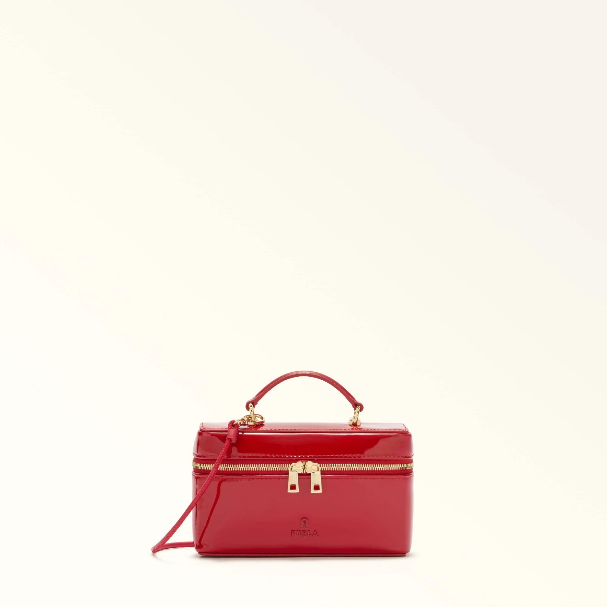 A radiant and elegant accessory, the Furla Camelia vanity case comes in soft patent leather. Its miniature size has just enough space for your cosmetics, jewellery or small personal items. Carried by its top handle or shoulder strap, it becomes a treasure chest for keeping your most prized possessions safe and sound. - Top handle - Detachable leather strap - Two-way zip fastening - Furla and Arch logos punched on the front Details Material: Patent Leather Strap information: Removable/Non Adjustable Leather Strap Strap Length Max: 44.09 in Strap Length Min: 44.09 in Product Code: WE00780BX02469100RT000 Plating: Light Gold+Inner Material Variant Dimensions in INCH 6,69 x 3,94 x 1,97 (w x h x d)