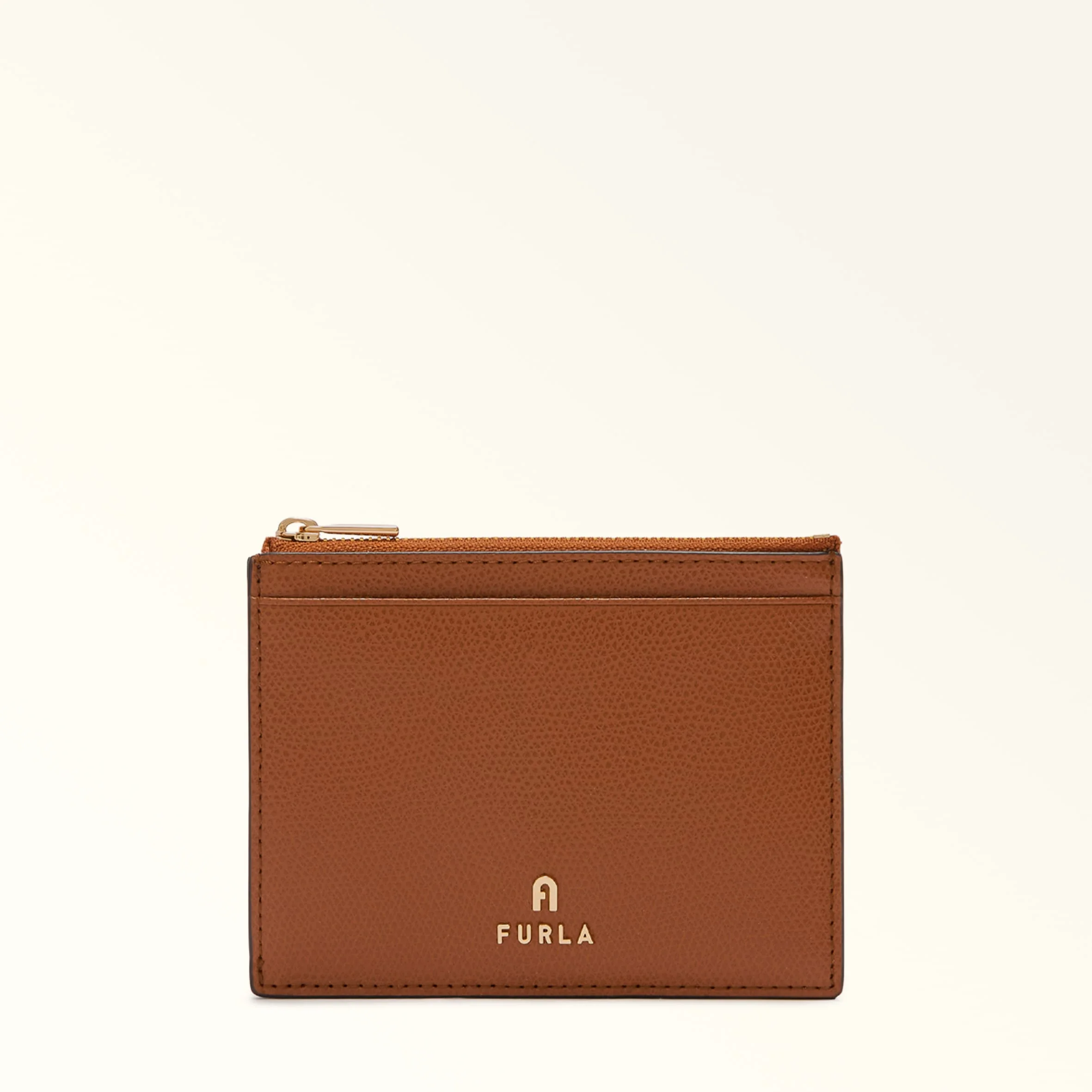 The Furla Camelia cardholder in exquisite printed leather is a practical must-have for keeping your cards and ID organised. Spacious but streamlined, it's slim enough to slip into your handbag. - Seven credit card and ID card slots on the back panel - Credit card and ID slot on the front panel - Zip closure - Furla and Arch logo punched on the front Details Exterior Details: 1 Cc Slot On Front Panel 7 Cc Slots On Back Panel Material: Textured Leather Hardware: Arch+Furla Lettering / Metal Zip Puller Product Code: WP00407ARE000100703B00 Internal Composition: 100% Viscose External Composition: 100% Leather Plating: Gold Dimensions in INCH 5,12 x 3,56 x 0,41 (w x h x d)