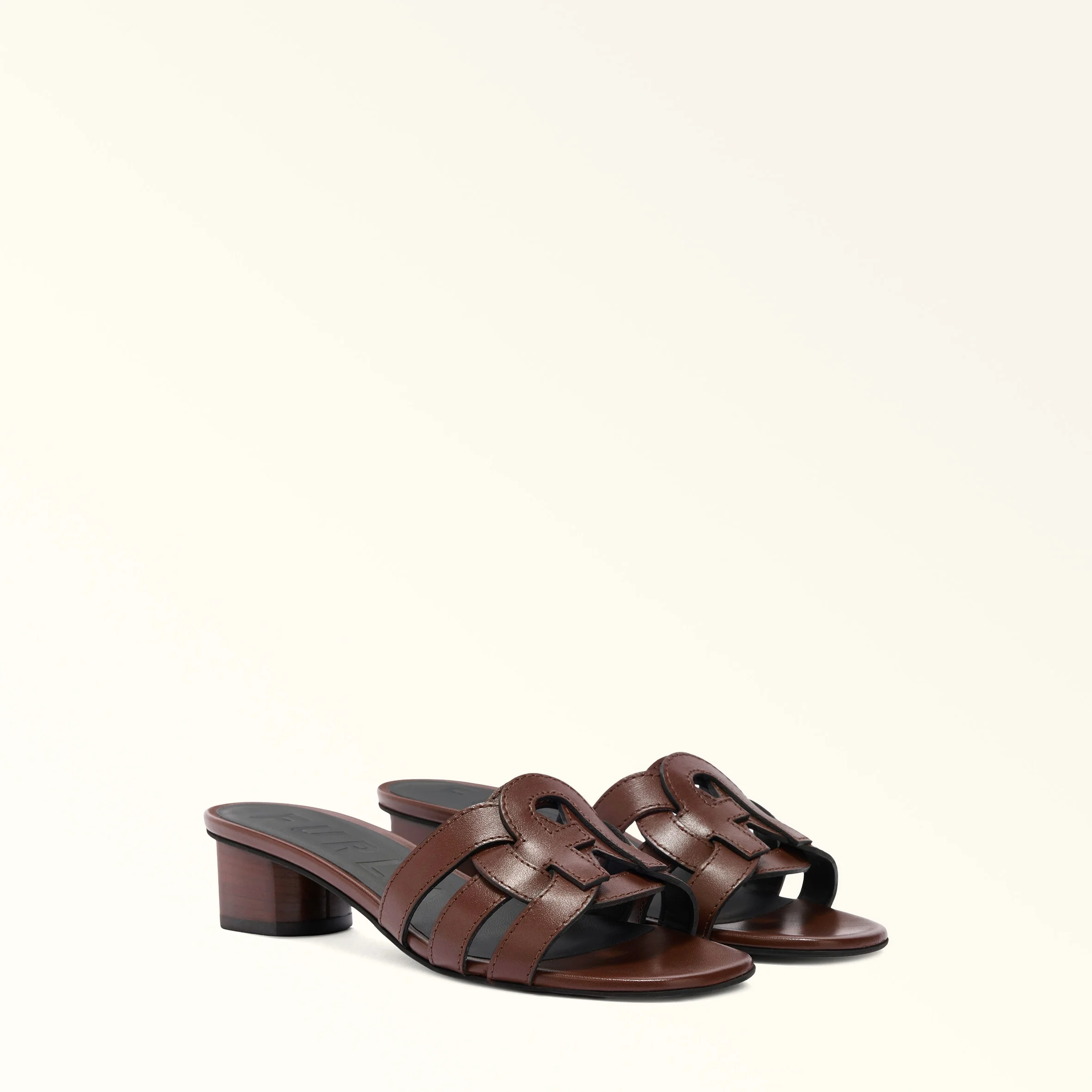 The Furla Cilindro sandals feature a wide cut-out strap reinterpreting the brand's iconic Arch logo. Made from soft smooth leather, they're perfect for all-day wear thanks to their covered chunky heel. - Medium 5 cm heel Details Interior Details: Synthetic lining Material: Calf Leather Heel Height: 1.97 in Heel Typology: Chunky Shoe tip: OPEN TOE Product Code: YL25CILY6200044012460S Plating: Basic Model