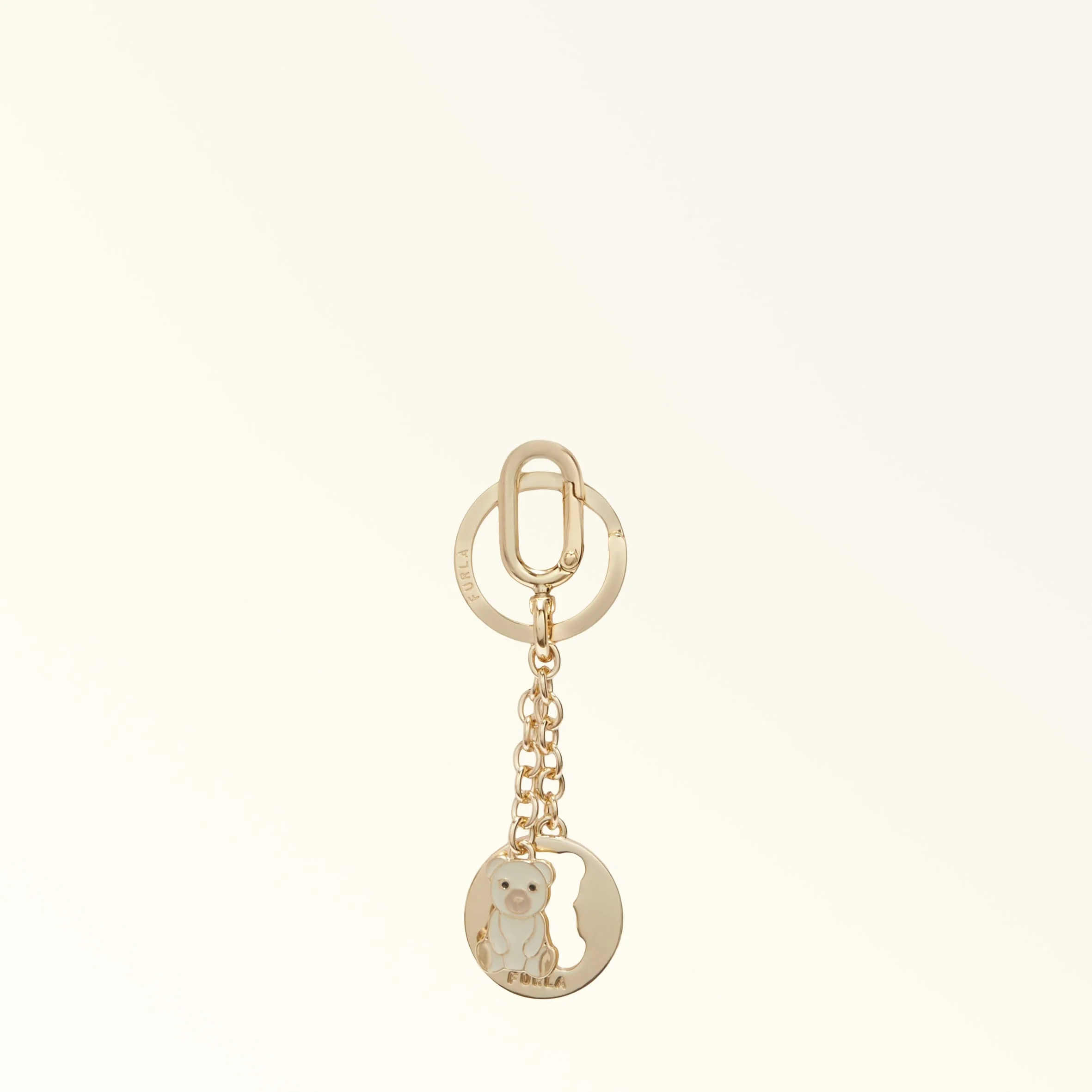 A cute accessory to attach to a bag or keep your keys together. Furla Crystal is a keyring featuring a metal disc with cut-out and a small enamelled teddy bear overlapping it at the front. It will give any look a touch of colour. - Snap hook and brise ring with engraved Furla logo Details Exterior Details: Furla Logo Engraved On The Metal Material: Metal + Enamel Hardware: Snap Hook/Brisee Ring Product Code: WR00796MES00010071704S External Composition: 70% Metal 10% Brass 10% Metal 10% Resin Plating: Gold Dimensions in INCH 1,18 x 4,13 (w x h)