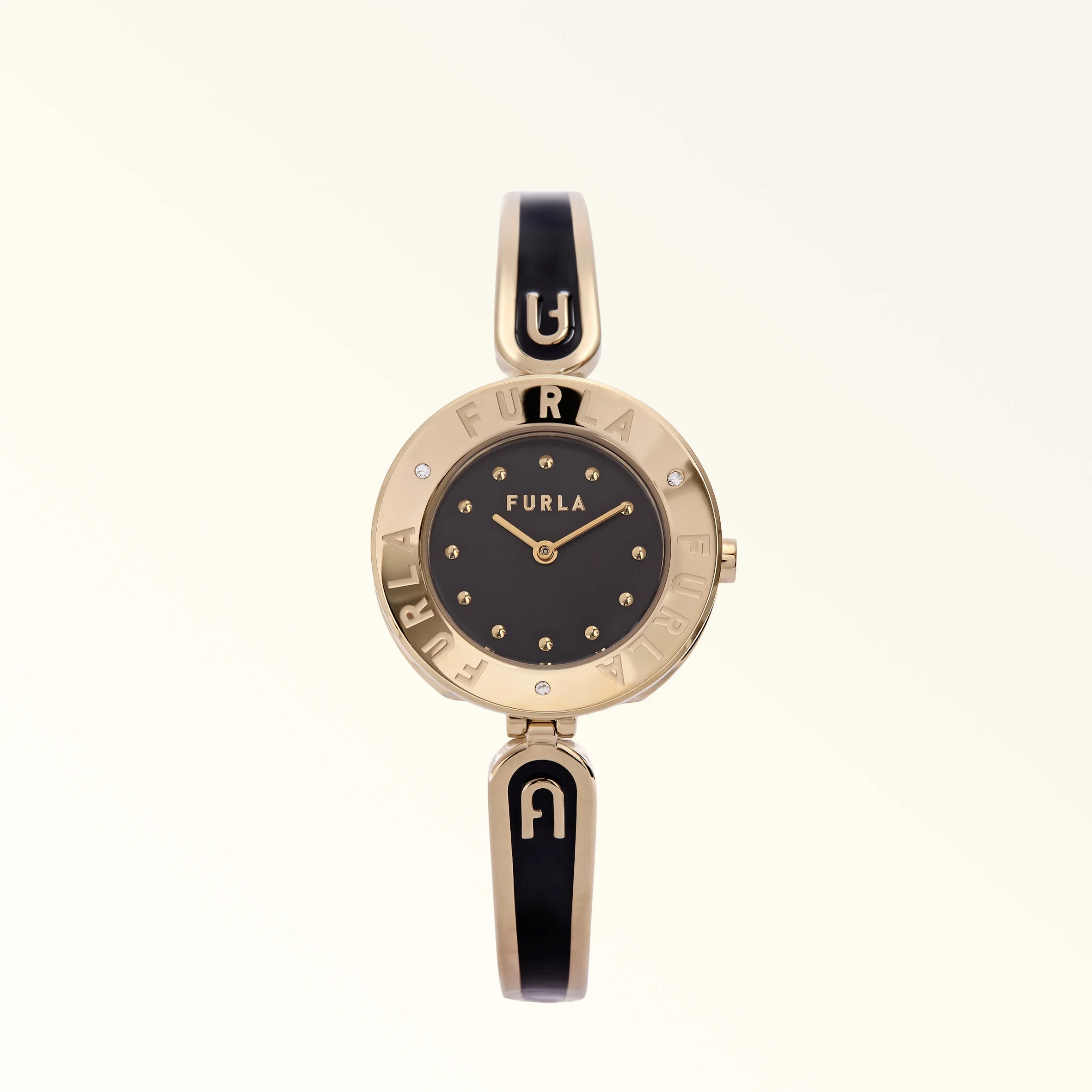 Furla Essential is an elegant and eye-catching watch with a round case. Its slim metal bracelet features a sophisticated resin detail in the same colour as the dial. Engraved around the bezel and alternated by small rhinestones, the Furla logo completes the design with a distinctive touch. - 30 mm case - Rhinestones set at three hour markers - Furla Arch logo on the twelfth hour marker To download the warranty and instruction manual for your watch, please click here Details Material: Metal + Resin Watch case Material: Metal Watch case Shape: Round Water resistance: 5 ATM Product Code: WW00107K220001007O6000 Plating: Gold Weight: 0.27 kg