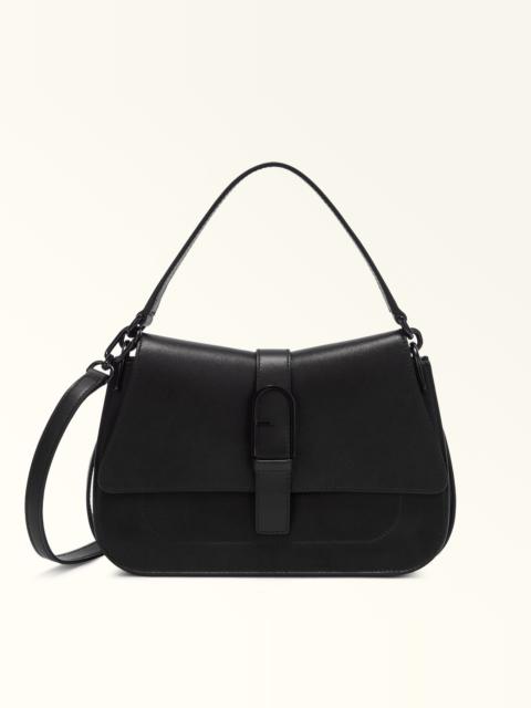 A sleek yet functional piece, this elegant Furla Flow bag is distinctive with its compact trapezoid shape and curved lines. An ideal companion for any occasion because of the versatility it affords, it can be carried by hand, worn on the shoulder or crossbody. It is crafted from soft and smooth nappa leather, and features a decorative buckle in the shape of the iconic Arch logo. - Open inside pocket - Open outside pocket on the back - Short leather top handle - Adjustable and removable long leather strap - Flap and magnetic button closure - Punched Furla logo Details Interior Details: 1 Flat Open Pocket Exterior Details: Furla Logo/Single Handle/Open Pocket On The Back Material: Claris Lux Calf Leather Strap information: Removable/adjustable leather strap Strap Length Max: 43.31 in Strap Length Min: 38.58 in Closure: Magnet Closure Hardware: Furla Arch Gasket Product Code: WB00996BX204510074556S Internal Composition: 50% Nylon 50% Polyurethane External Composition: 100% Leather Plating: Gold Weight: 0.56 kg Dimensions in INCH 9,84 x 6,1 x 3,15 (w x h x d)