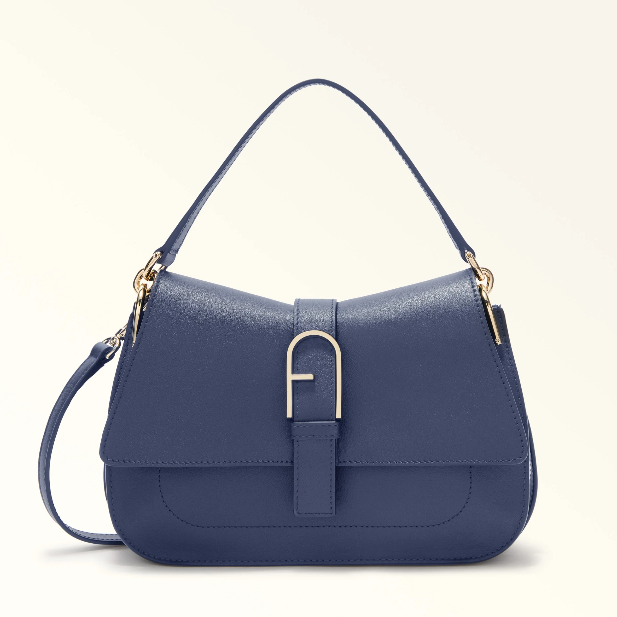 A sleek yet functional piece, this elegant Furla Flow bag is distinctive with its compact trapezoid shape and curved lines. An ideal companion for any occasion because of the versatility it affords, it can be carried by hand, worn on the shoulder or crossbody. It is crafted from soft and smooth nappa leather, and features a decorative buckle in the shape of the iconic Arch logo. - Open inside pocket - Open outside pocket on the back - Short leather top handle - Adjustable and removable long leather strap - Flap and magnetic button closure - Punched Furla logo Details Interior Details: 1 Flat Open Pocket Exterior Details: Furla Logo/Single Handle/Open Pocket On The Back Material: Claris Lux Calf Leather Strap information: Removable/adjustable leather strap Strap Length Max: 43.31 in Strap Length Min: 38.58 in Closure: Magnet Closure Hardware: Furla Arch Gasket Product Code: WB00996BX204510074533S Internal Composition: 50% Nylon 50% Polyurethane External Composition: 100% Leather Plating: Gold Dimensions in INCH 9,84 x 6,1 x 3,15 (w x h x d)